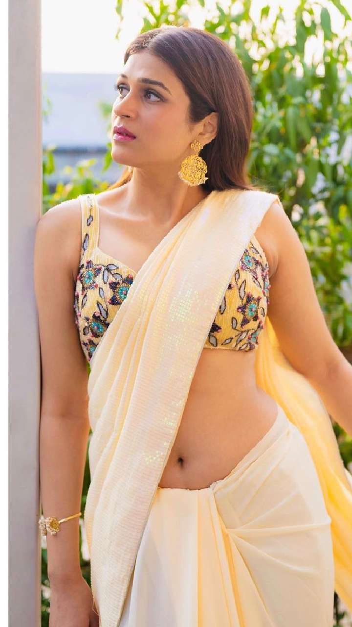 एक्ट्रेस का ये ऑफ व्हाइट प्लेन साड़ी संग वर्क ब्लाउज बेहद किलर लुक दे रहा है।