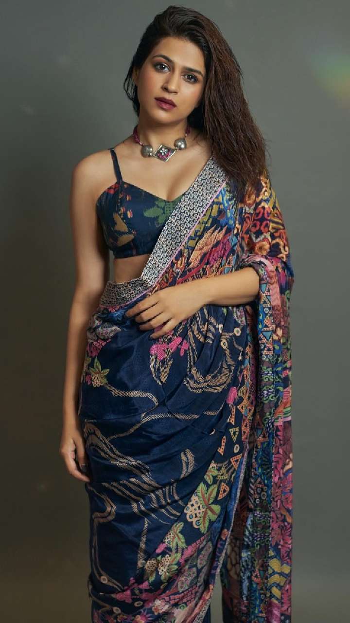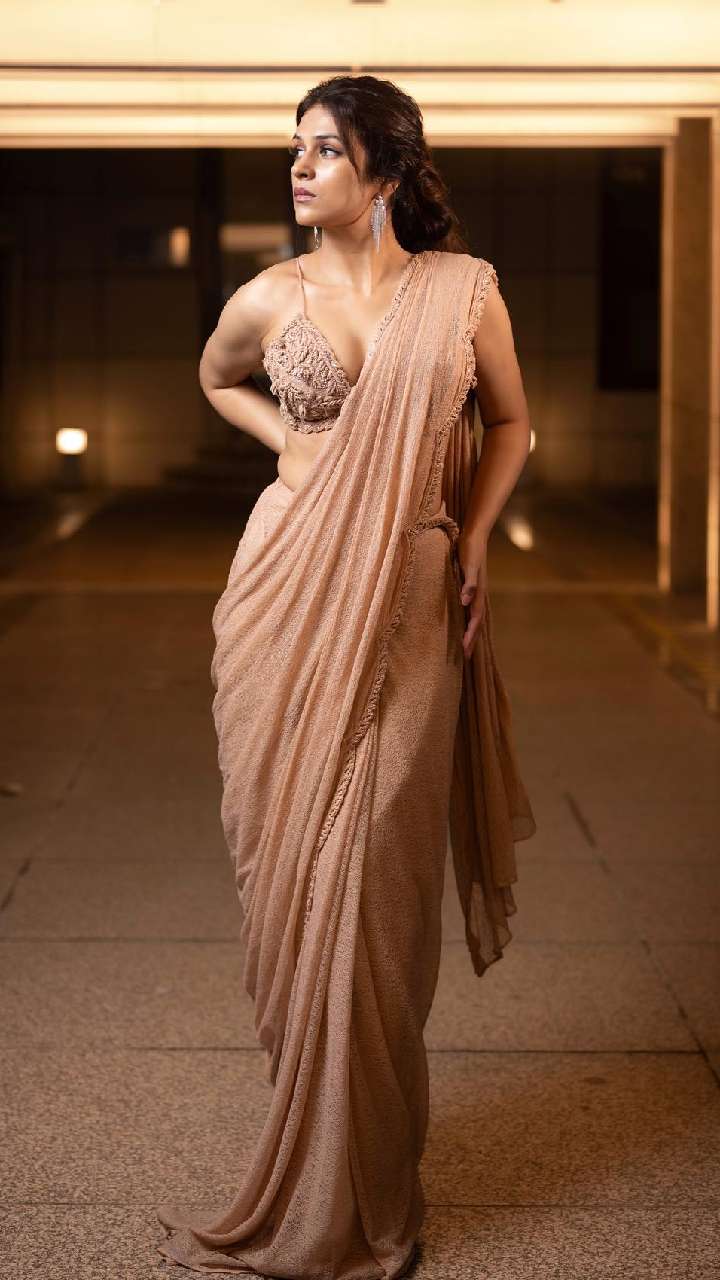 आप श्रद्धा दास के इस लुक को भी स्टाइल कर सकती हैं। श्रद्धा दास ने डीप नेक ब्लाउज के साथ साड़ी पेयर की है।