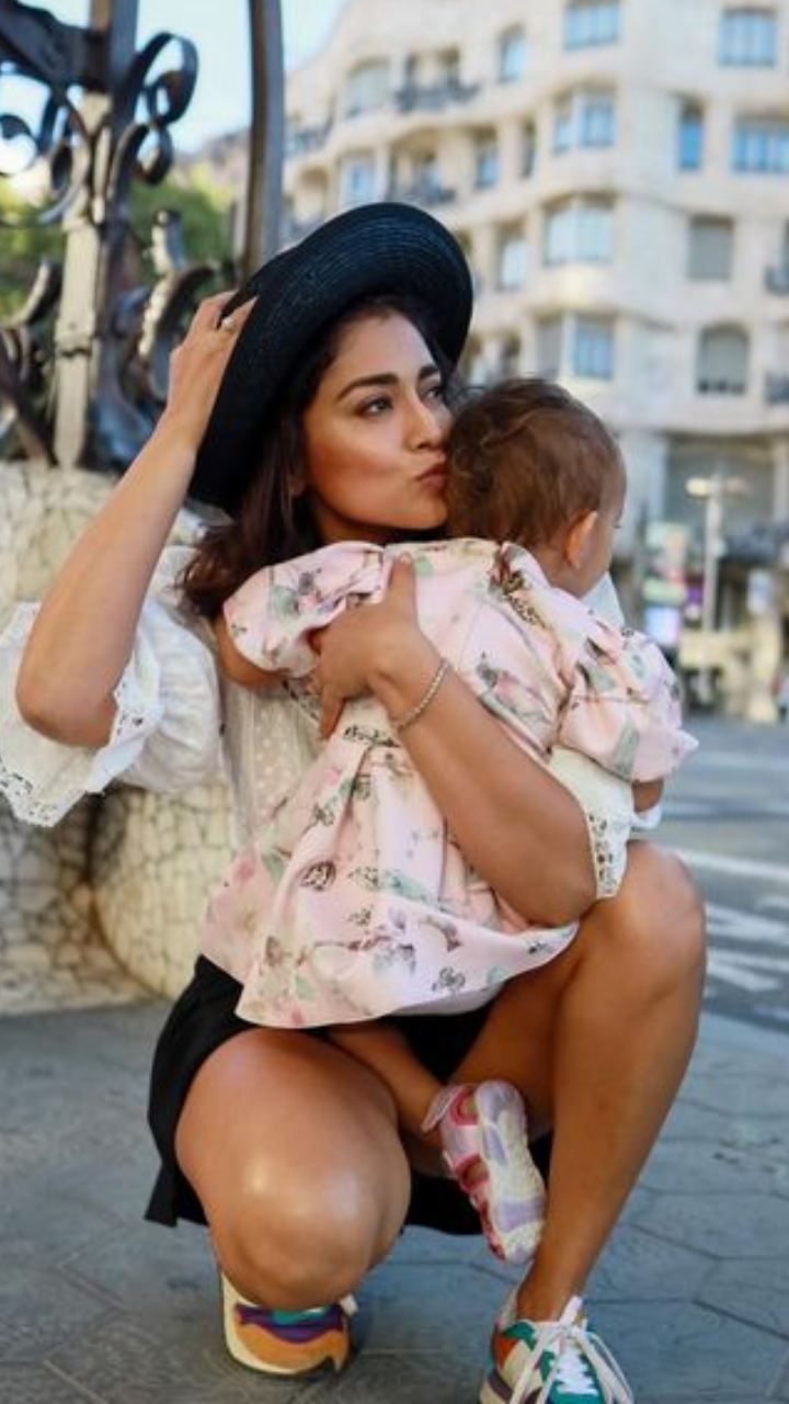 इस फोटो में श्रिया अपनी बेटी को गोद में उठाकर प्यार से हग कर रही हैं।
