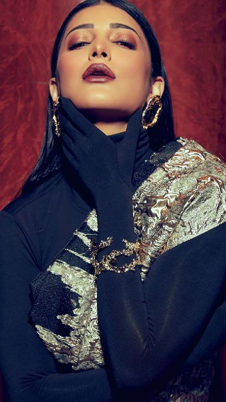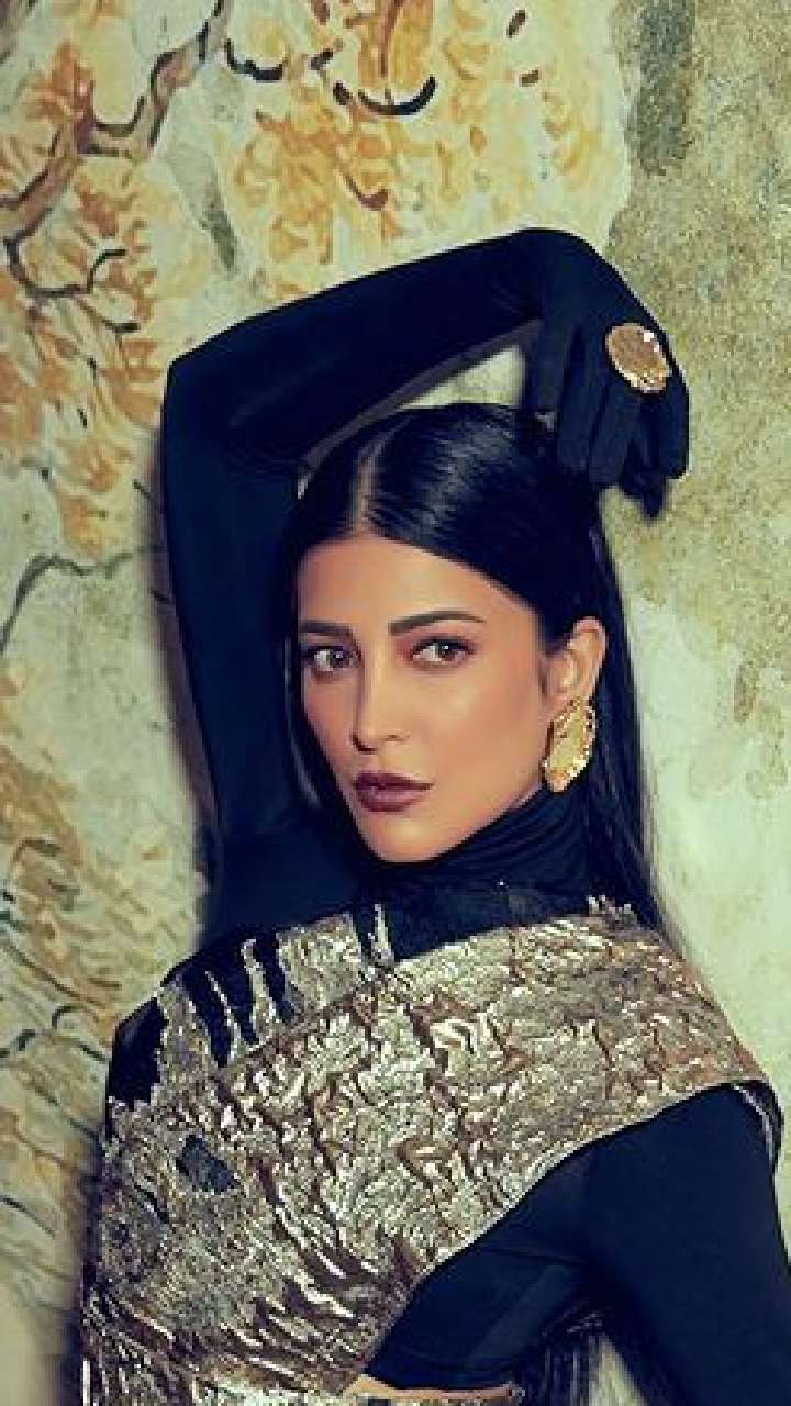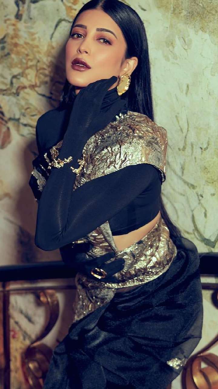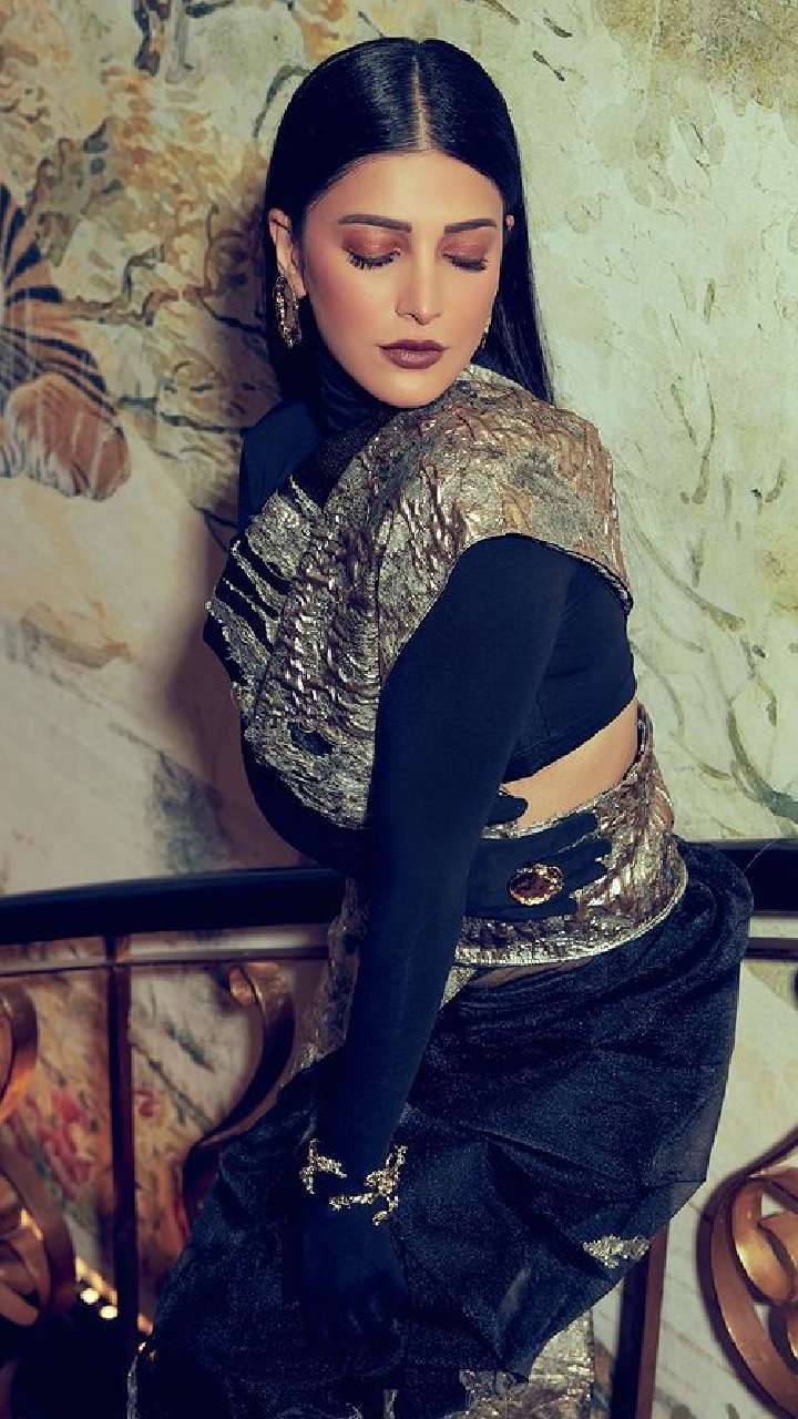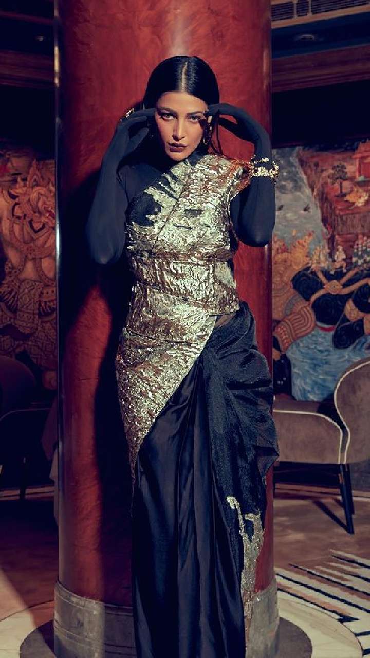 लेटेस्ट फोटोज में एक्ट्रेस ने ब्लैक साड़ी पहनी है जिसमें गोल्डन वर्क किया गया है। श्रुति ने हाथ में ग्लव्स भी पहने हुए हैं।