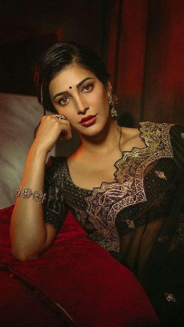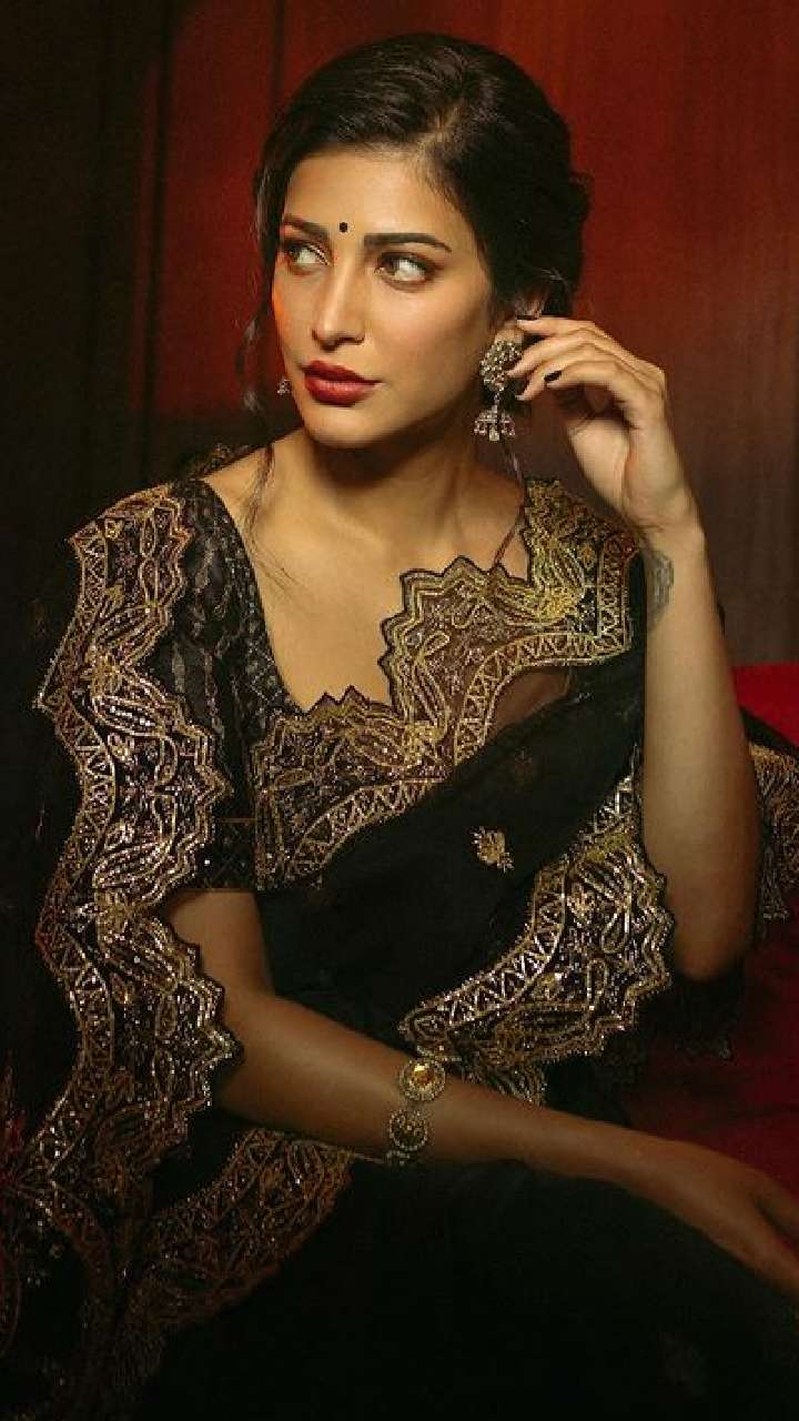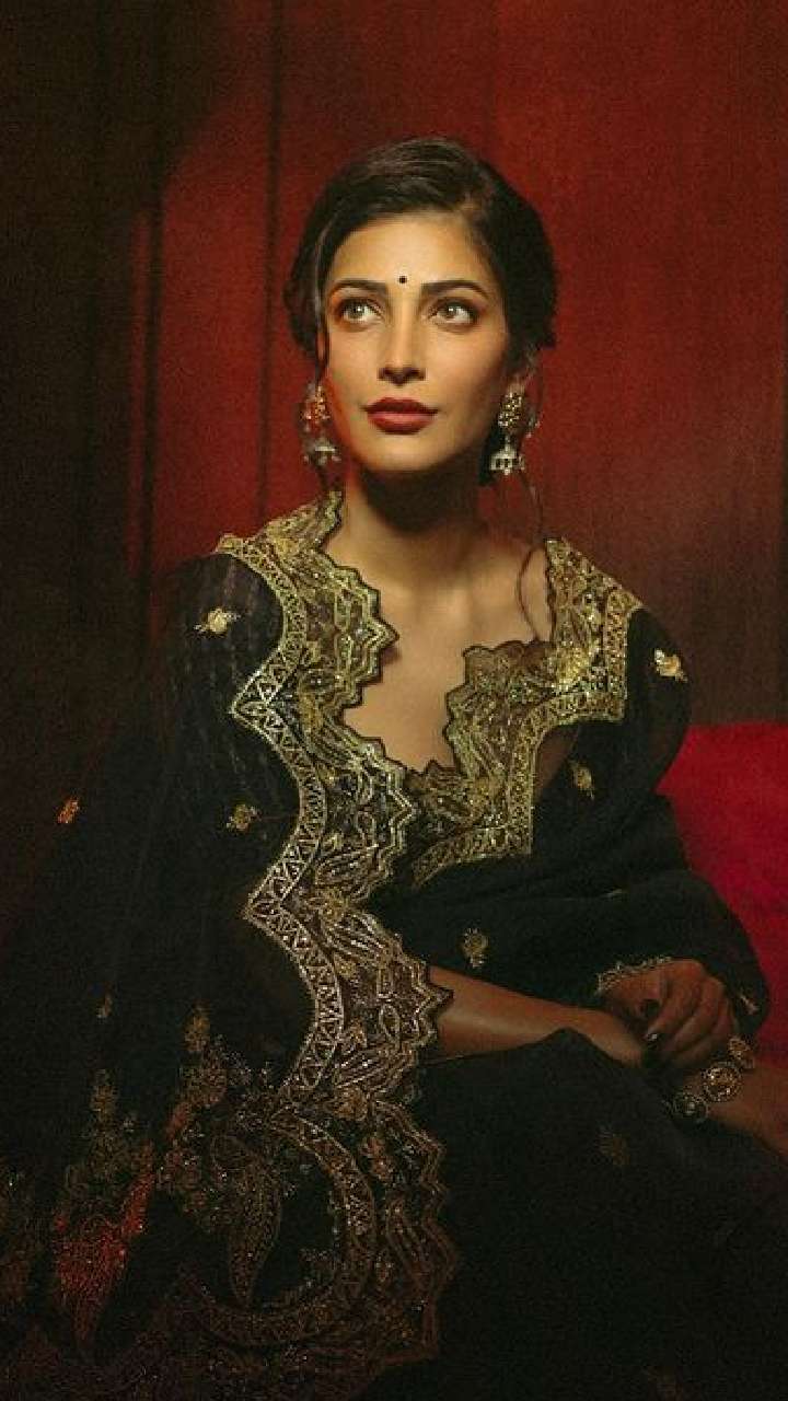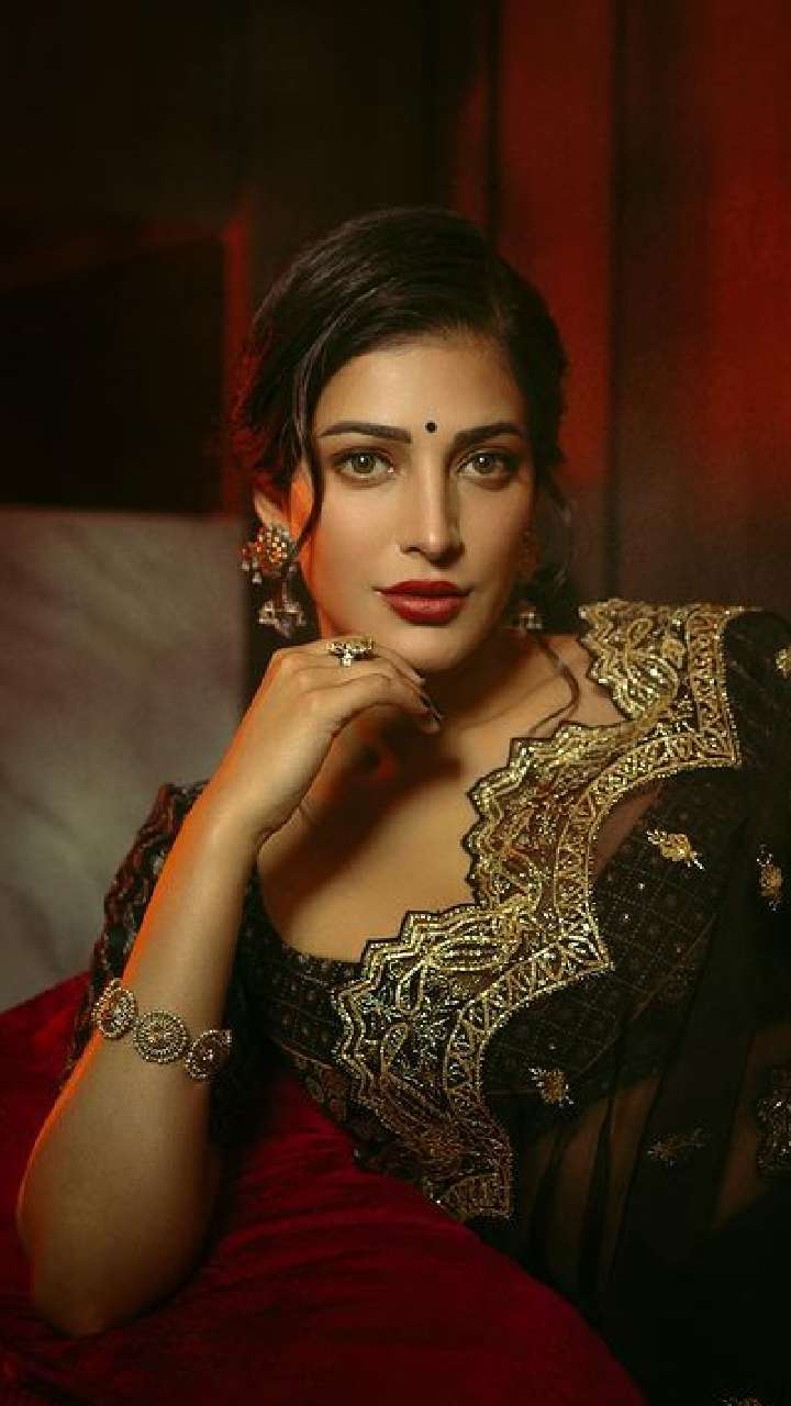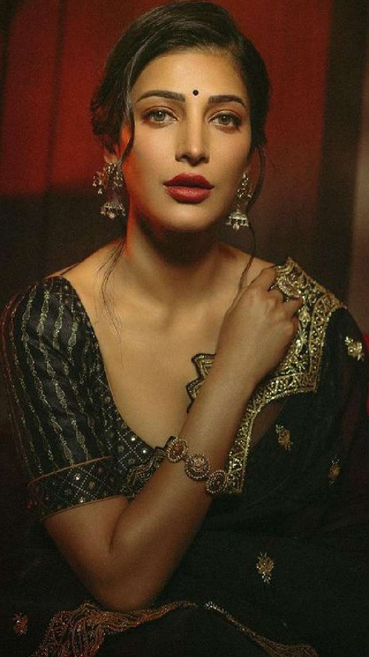 एक्ट्रेस का ओवरऑल लुक बेहद सुंदर है। साड़ी लुक के साथ श्रुति हासन ने बोल्ड मेकअप किया है।