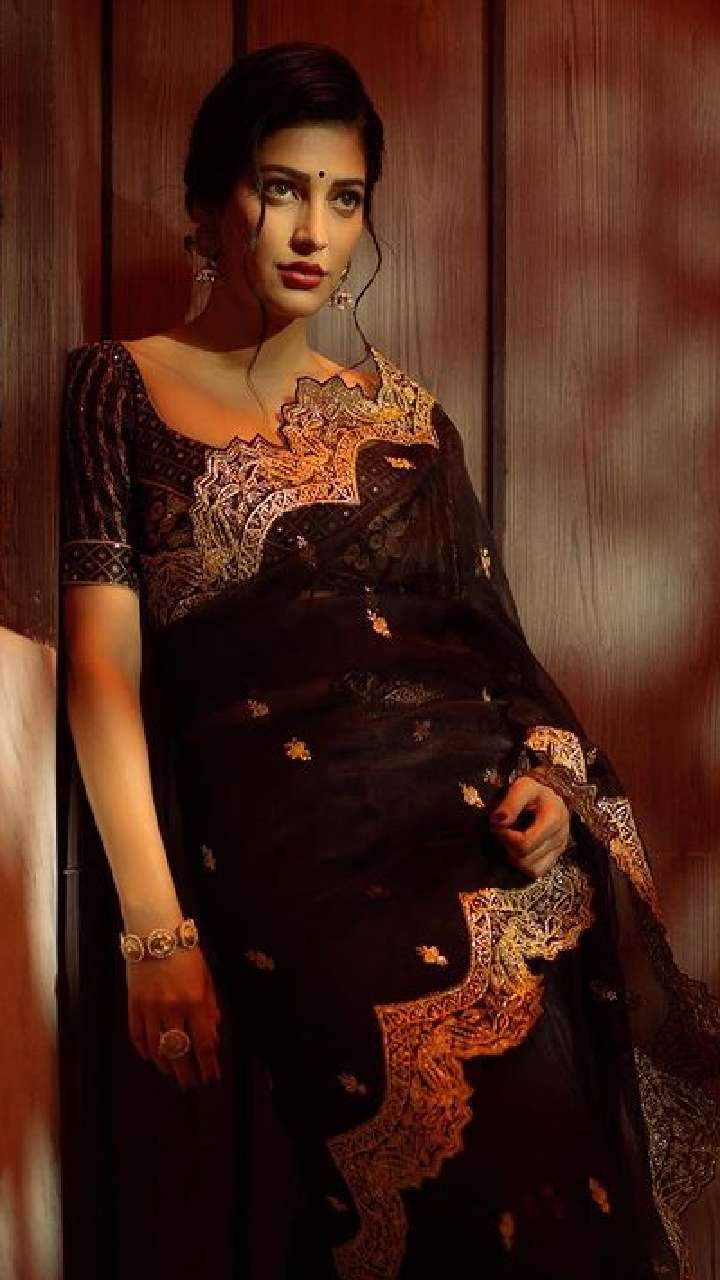 ब्लैक कलर की साड़ी को गोल्डन बॉडर और खूबसूरत बना रहीं हैं, आप भी एक्ट्रेस के लुक को फॉलो कर सकते हैं।