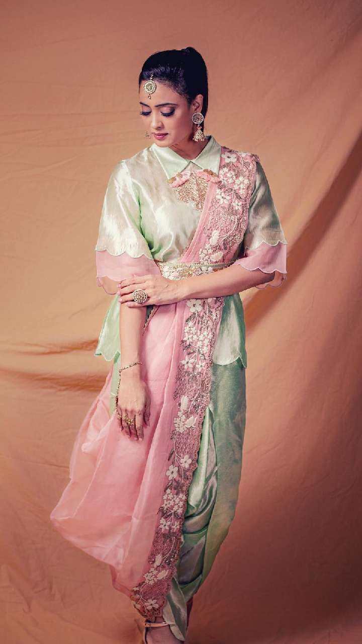 आप इस तरह की रेडी टू वियर धोती स्टाइल साड़ी भी ट्राई कर सकती हैं। इसके साथ डीवा के जैसे कानों में मैचिंग झुमके मांग टीका और पौनी हेयर स्टाइल बेस्ट रहेगी।
