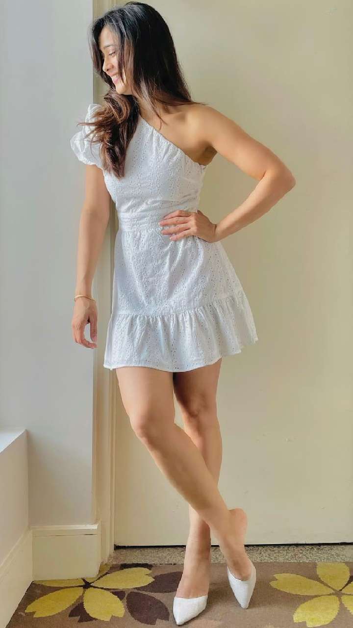 एक्ट्रेस व्हाइट कलर की चिकन वर्क वन शोल्डर ड्रेस में काफी स्मार्ट लग रही हैं। आप उनकी इस ड्रेस को अपना ऑफिस लुक भी बना सकती हैं।