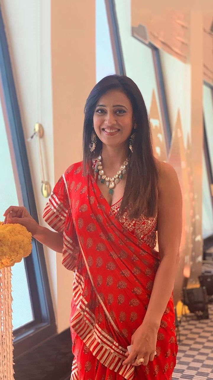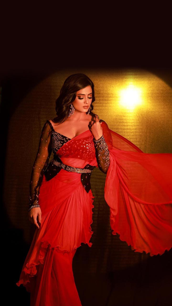 इस तस्वीर में श्वेता तिवारी रेड कलर की ट्रांसपेरेंड साड़ी में पोज देती दिख रही हैं।