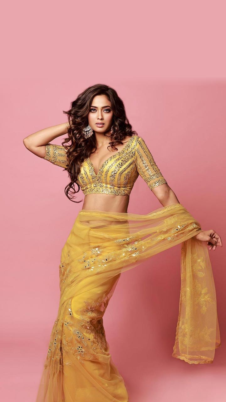 श्वेता तिवारी पीले रंग की नेट साड़ी में बेहद ग्लैमसर लग रही हैं।