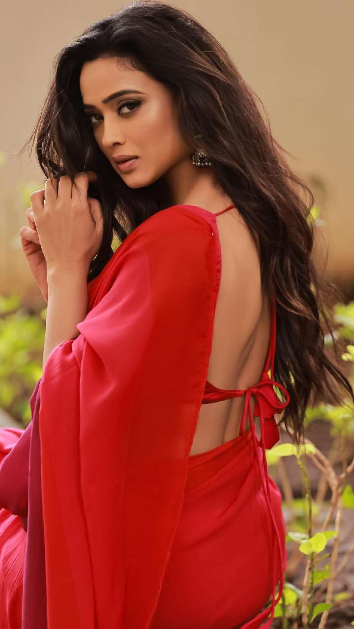 एक्ट्रेस ने रेड कलर की प्लेन साड़ी के साथ प्लेन बैकलेस डोरी हॉट ब्लाउज पेयर किया है।