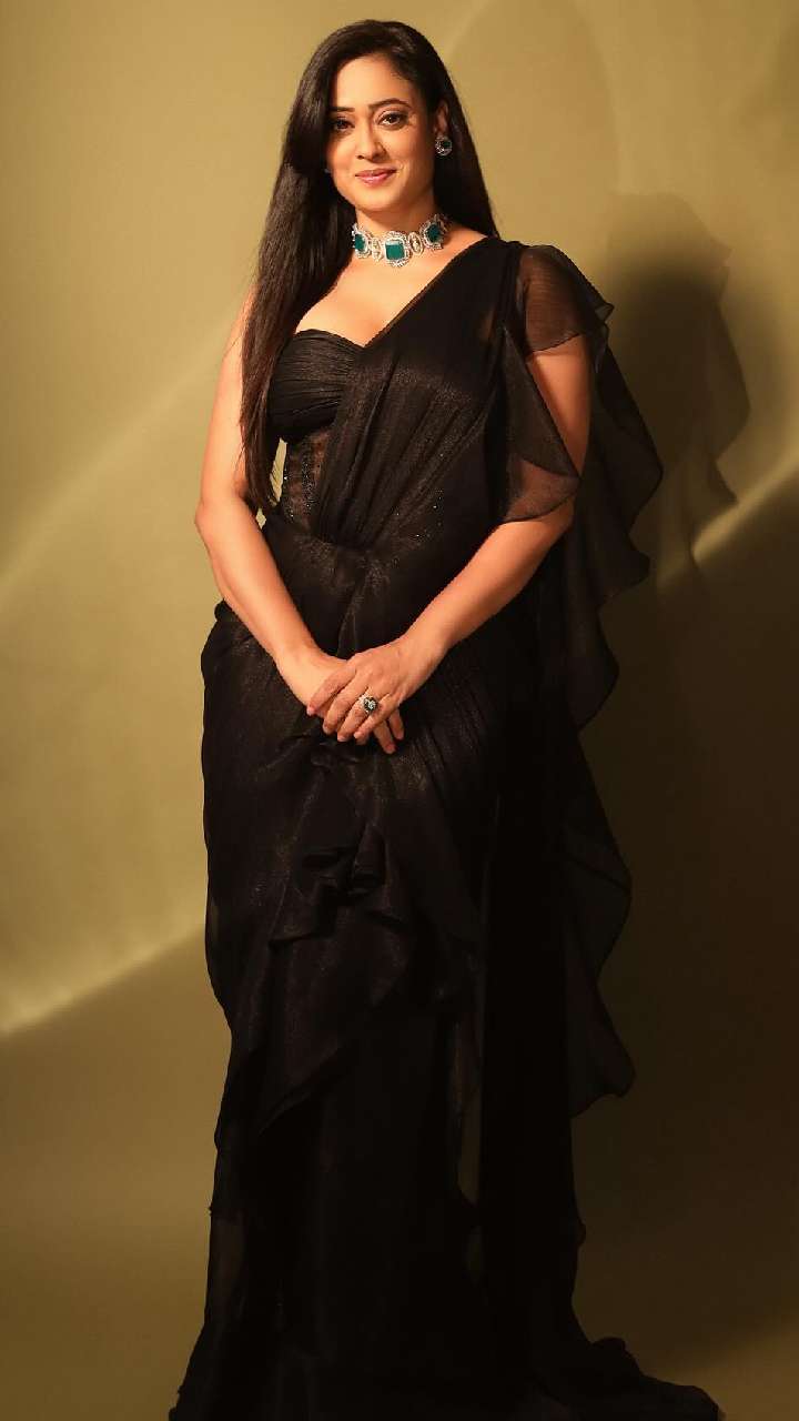 इस डिजाइनर ब्लैक साड़ी में श्वेता काफी ग्लैमरस लग रही हैं। एक्ट्रेस ने डिजाइनर साड़ी के साथ एक बहुत ही खूबसूरत कोर्सेट ब्लाउज कैरी किया हुआ है जो उनकी पर्सनैलिटी को काफी निखार के दिखा रहा है।