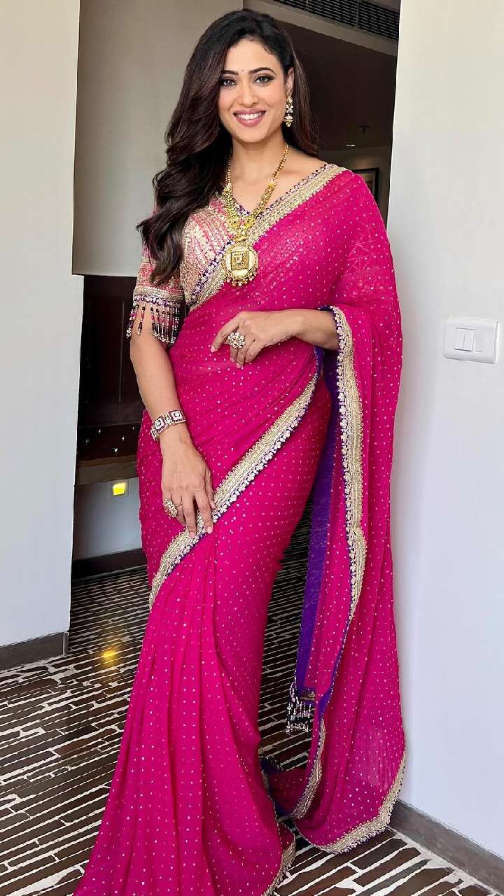 एक्ट्रेस की रानी पिंक साड़ी काफी खूबसूरत लग रही हैं। इस साड़ी का लुक आपको शादियों में एक क्लासी और बेहद खूबसूरत लुक देगा।