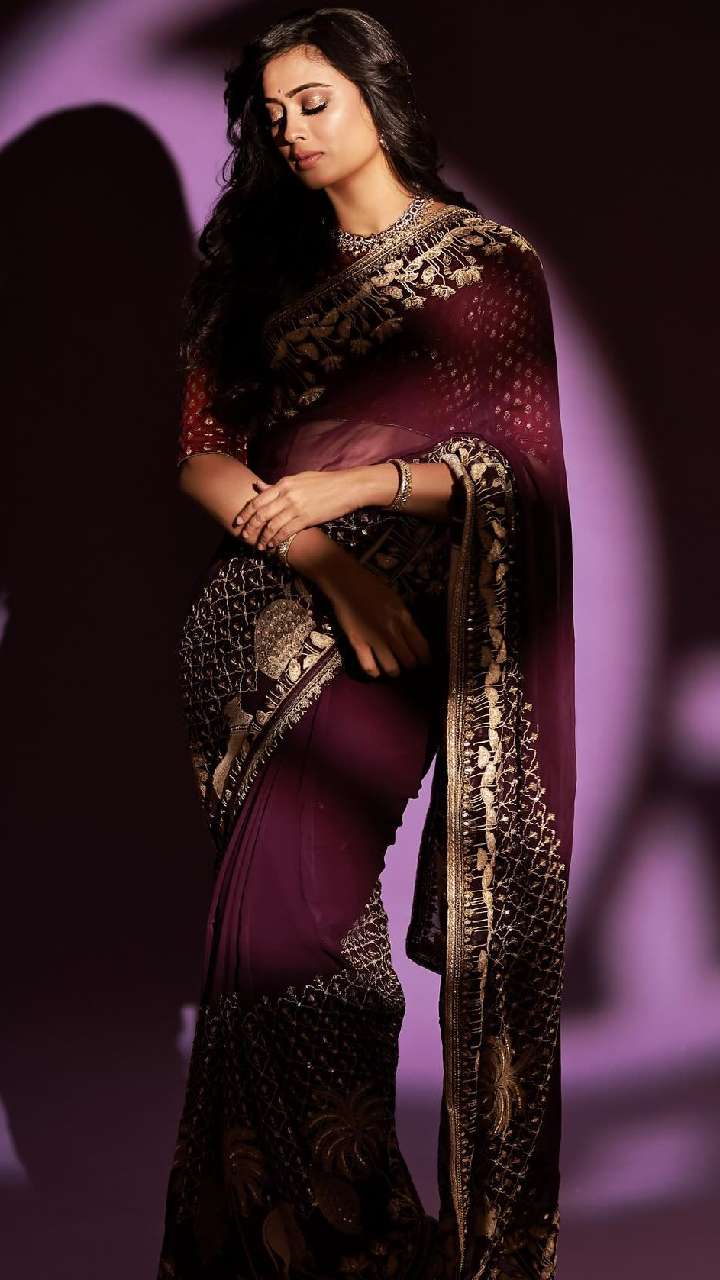 Shweta Tiwari की इस प्लेन मेहरून साड़ी में उनका नेकलेस चार चांद लगा रहा है। आप ऐसी साड़ी को पहनकर स्टाइलिश के साथ साथ स्लिम और स्टाइलिश भी लग सकती हैं।