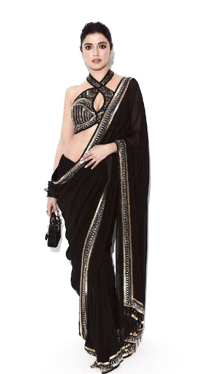 फेमस एक्ट्रेस दिव्या खोसला इस ब्लैक साड़ी में काफी ज्यादा बोल्ड लग रहीं हैं। साथ ही एक्ट्रेस ने हैवी वर्क का हॉल्टर नेक ब्लाउज पेयर किया है।
