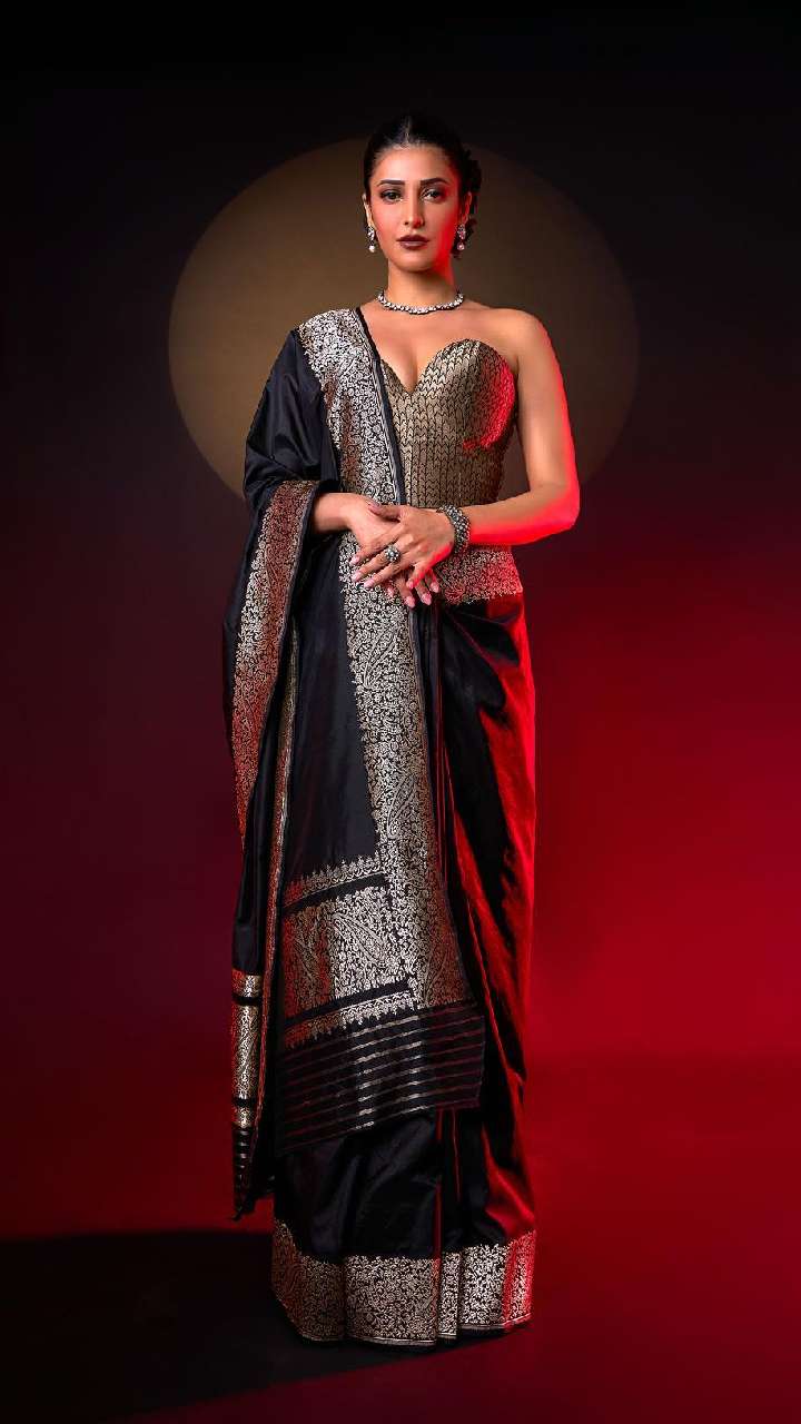 ब्लैक कलर की साड़ी के साथ साउथ स्टार श्रुति हासन ने हार्ट शेप ब्लाउज कैरी किया है। श्रुति का हर लुक शानदार होता है।