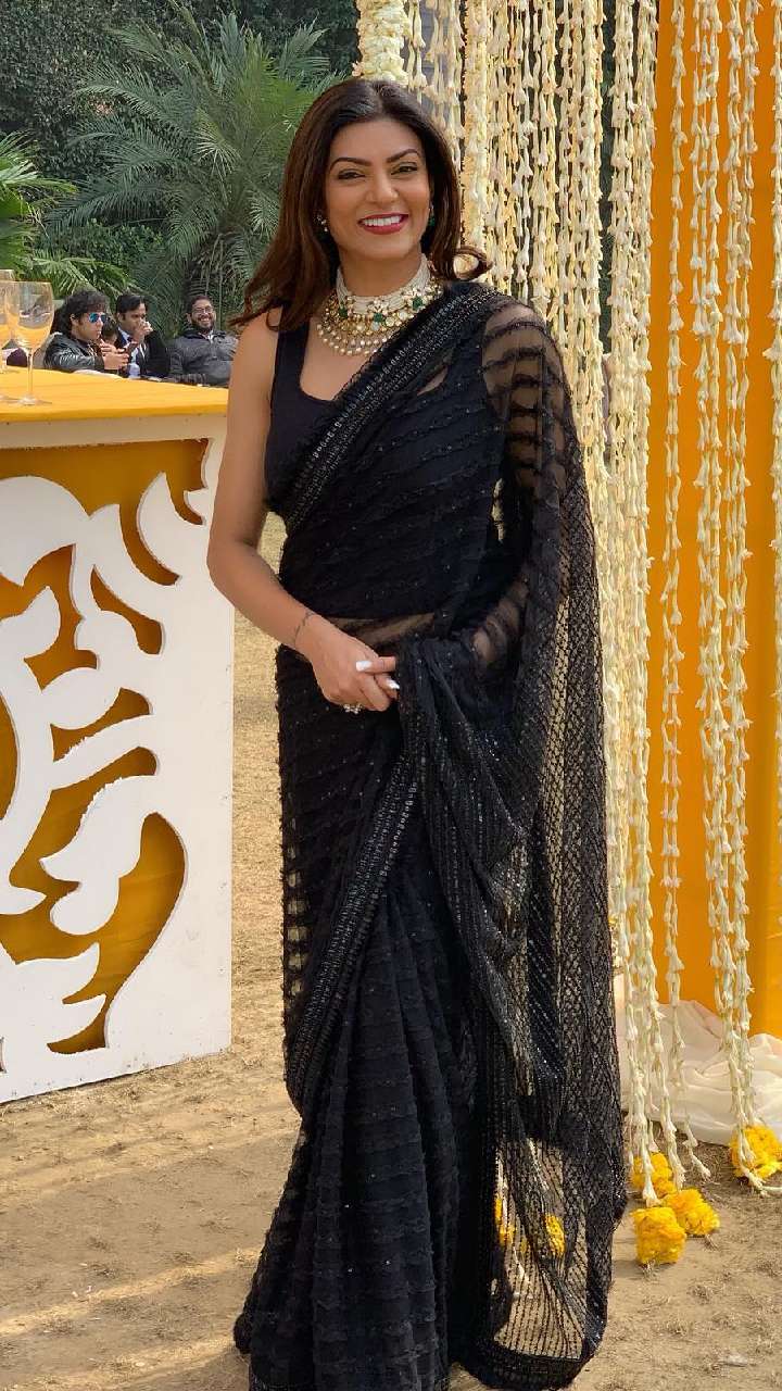 1994 की मिस युनिवर्स सुष्मिता सेन का ये ब्लैक साड़ी लुक भी कमाल का है। साड़ी के साथ एक्ट्रेस ने छोटे मोती का हार पेयर किया है।