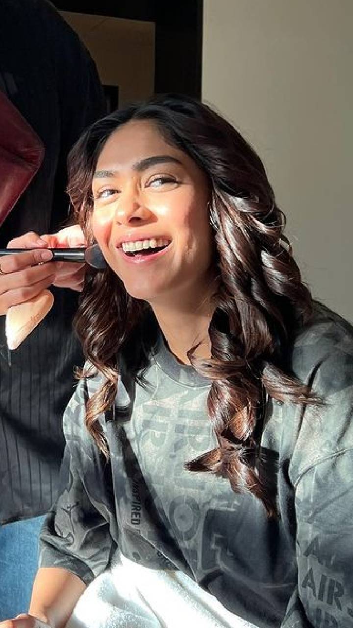 मृणाल की ये तस्वीर मेकअप करवाने के दौरन की हैं, एक्ट्रेस इस फोटो में बेहद क्यूट लग रही हैं।