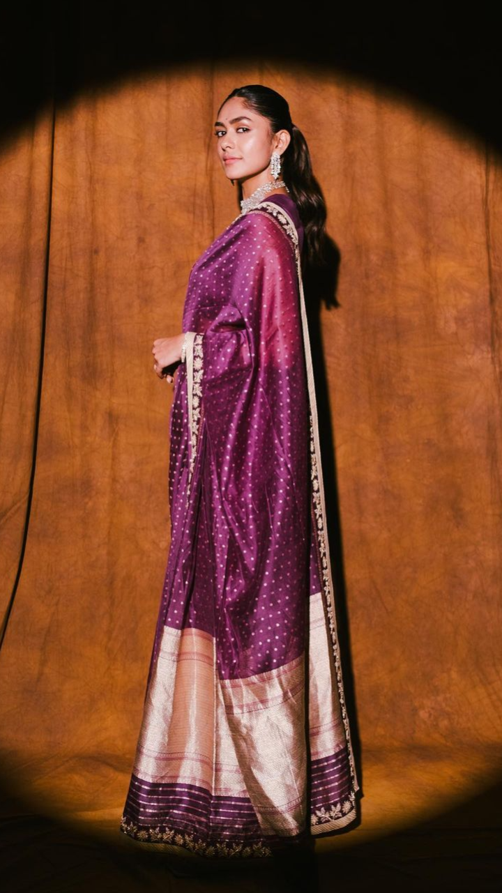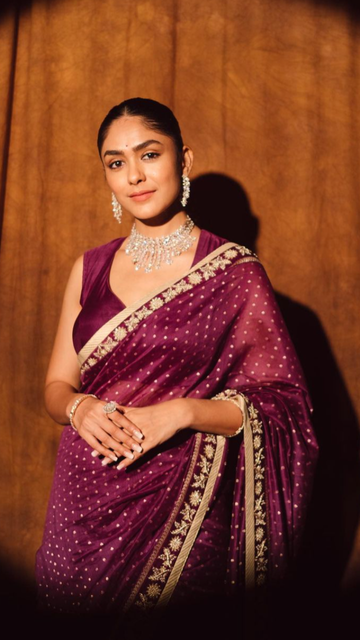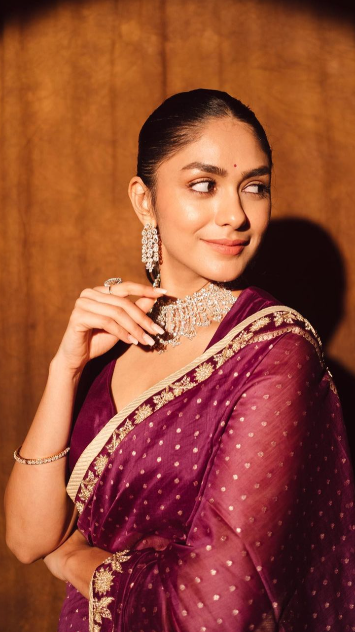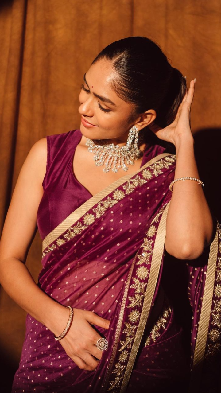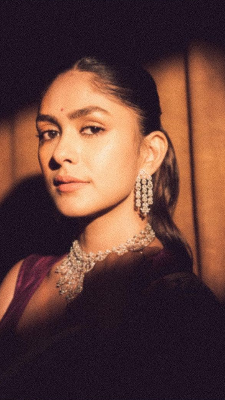 मृणाल ने पर्पल कलर की साड़ी पहनी हुई हैं और जूड़ा बनाया हुआ हैं जो बहुत ही सुंदर हैं।