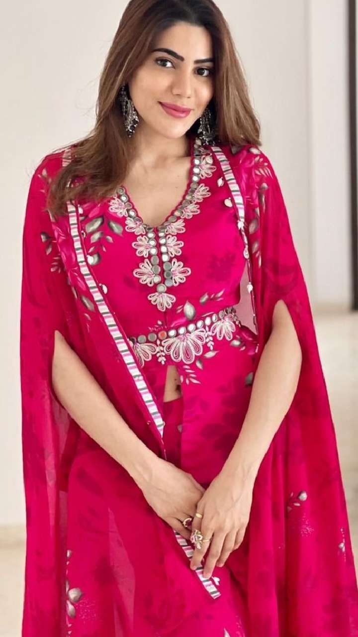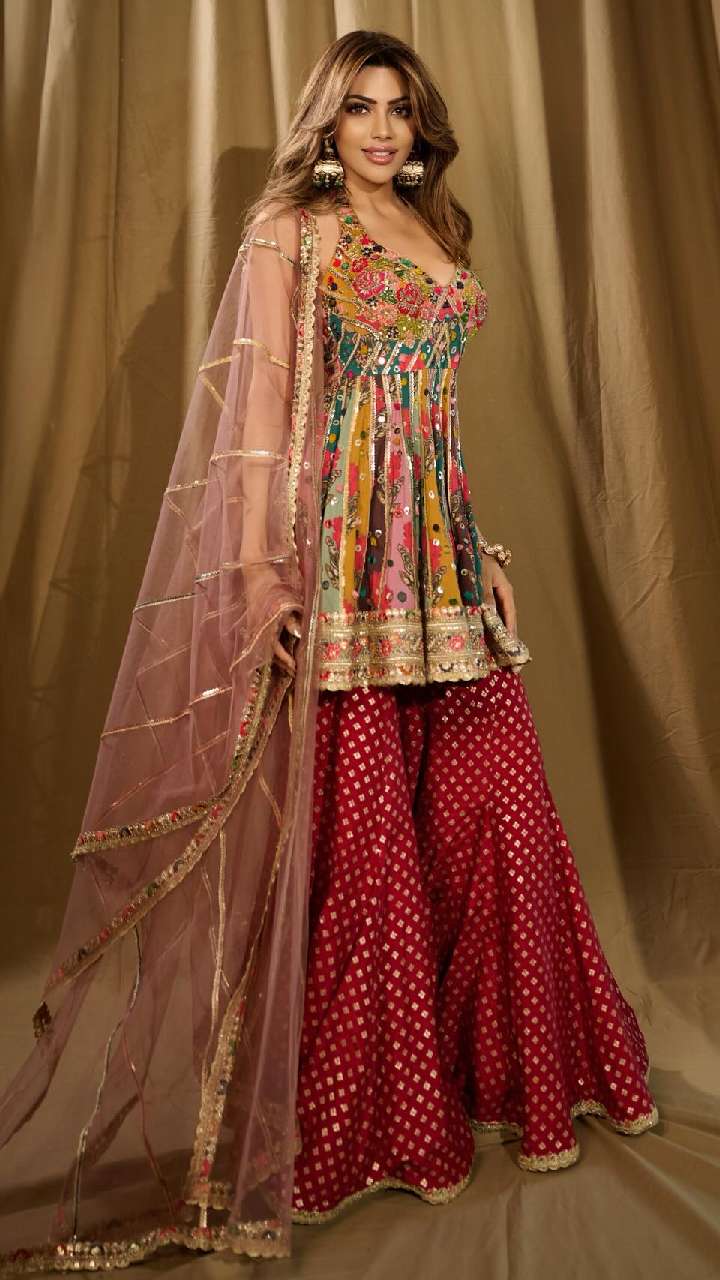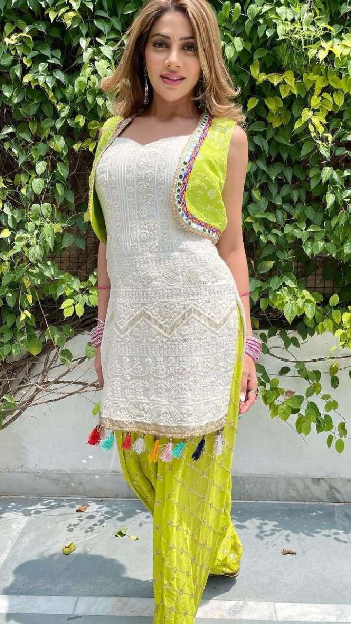 Nikki के इस सूट का डिजाइन काफी यूनिक और देखने में बेहद एलिगेंट लुक दे रहा है। आप पार्टी में सूट को बोल्ड मेकअप और कर्ली हेयर स्टाइल के साथ पहनकर पार्टी की शान बन सकती हैं।