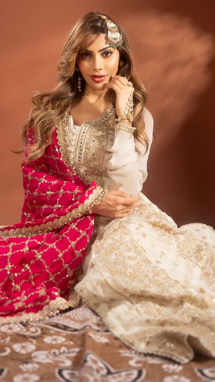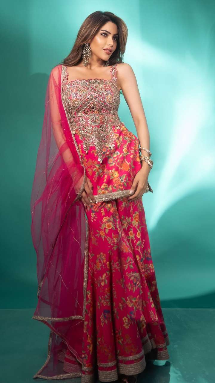 Nikki Tamboli ने डिजाइनर सूट के साथ ग्लिटरी बोल्ड मेकअप और पिंक लिपस्टिक से अपने लुक में चार चांद लगाए है। गोरी लड़कियां एक्ट्रेस की तरह सूट को स्टाइल कर सकती हैं। साथ ही, कर्ली हेयर स्टाइल बेहद खूबसूरत लगेंगे।