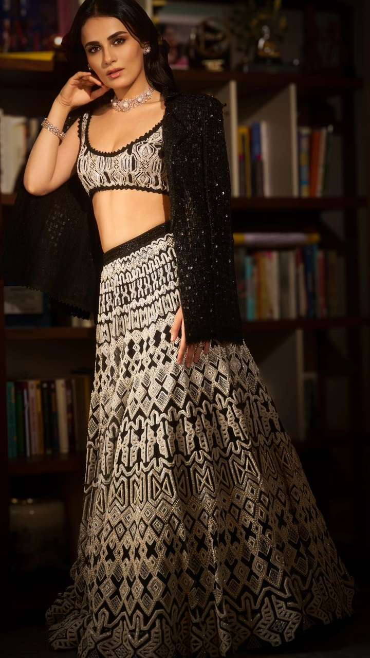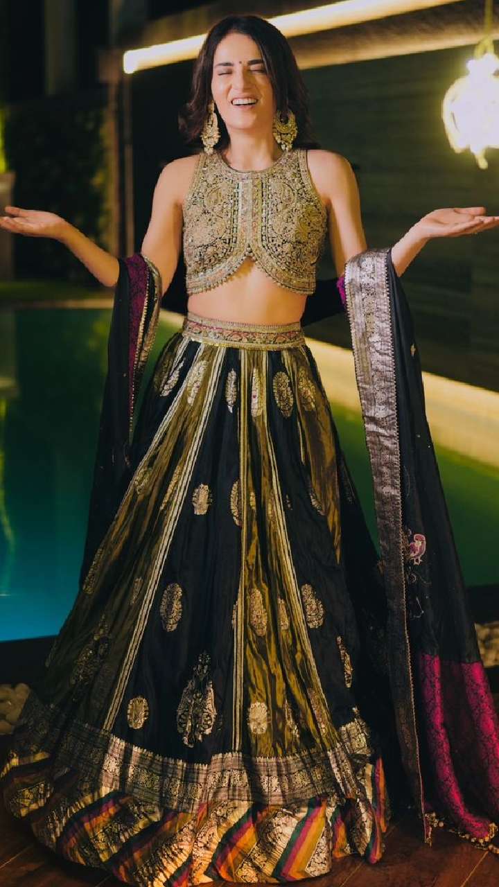 कुछ आउटफिट्स ऐसे होते हैं, जिसमें लड़कियां कुछ ज्यादा ही पतली और लंबी लगती हैं और लहंगा उन्हीं में से एक आउटफिट है। राधिका का यह स्टाइलिश डिजाइनर कोट वाला लहंगा काफी ज्यादा सुंदर है। आप भी ऐसा डिजाइन अपनाकर स्टाइलिश के साथ-साथ हाई हील्स कैरी करके खुद को एकदम मॉडर्न लुक दे सकती हैं।