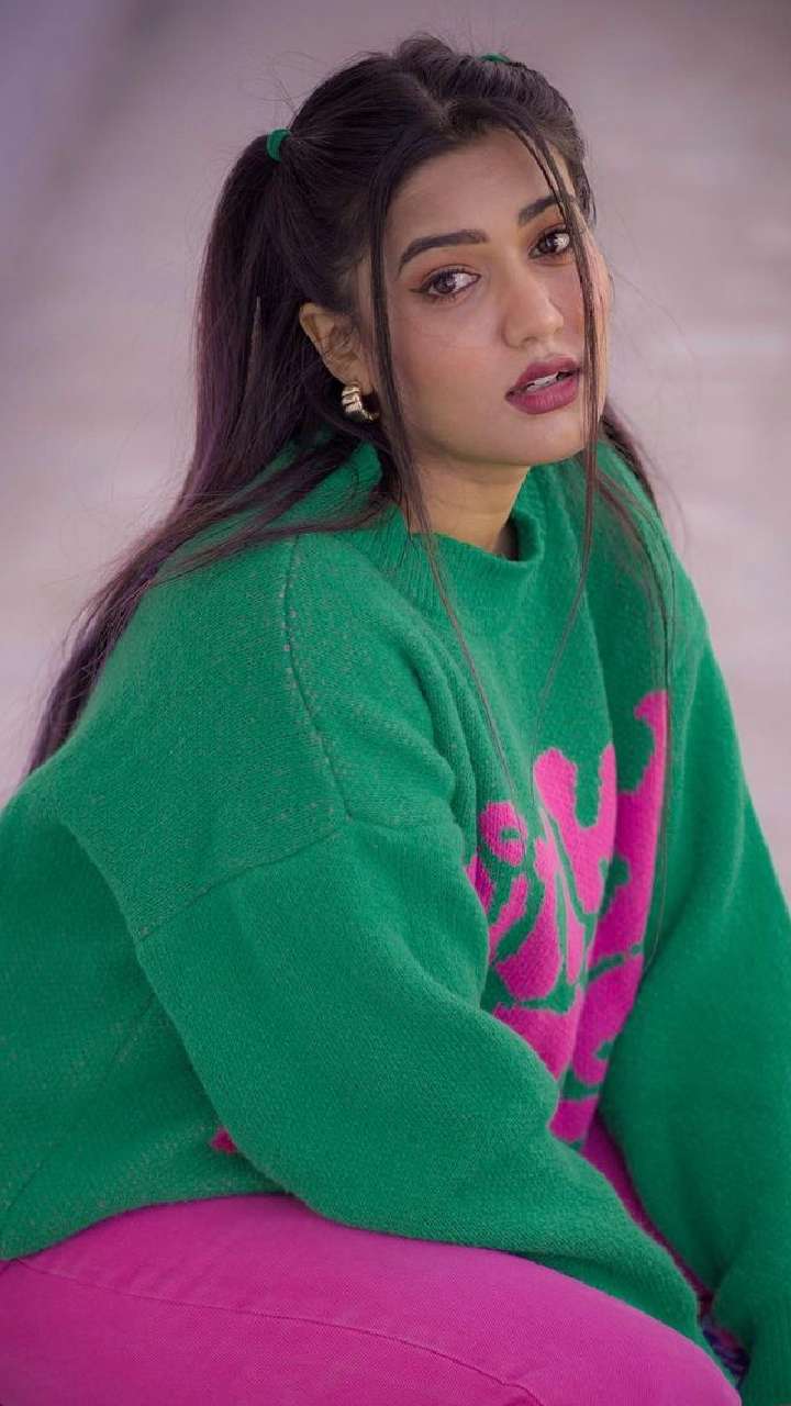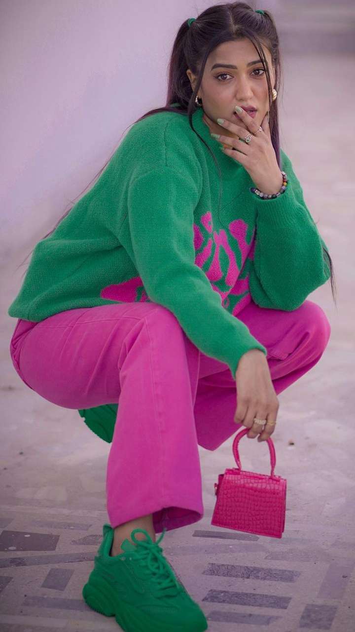 गरिमा चौरसिया ने पिंक और ग्रीन कलर का आउटफिट पहने हैं।