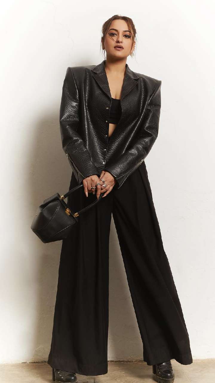 यदि आप ब्लैक लवर हैं तो सोनाक्षी का ऑल ब्लैक लुक विद फ्लेयर पेंट आपके पार्टी लुक में जान डाल देगा।
