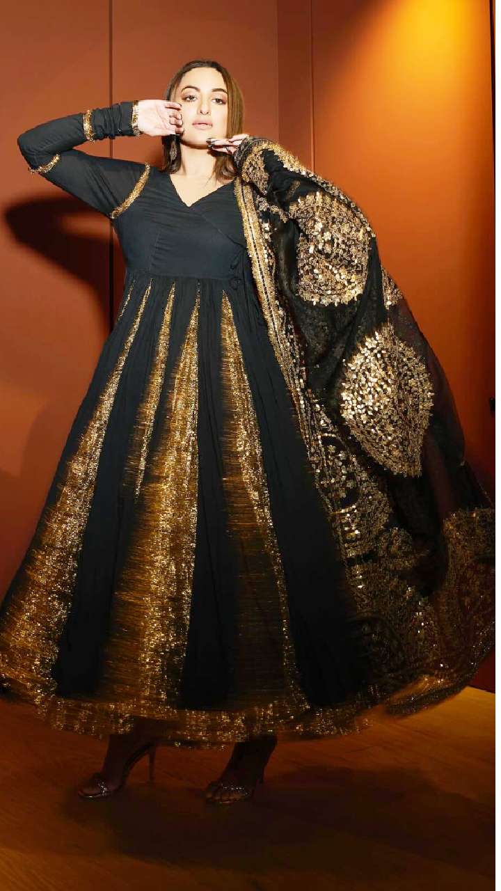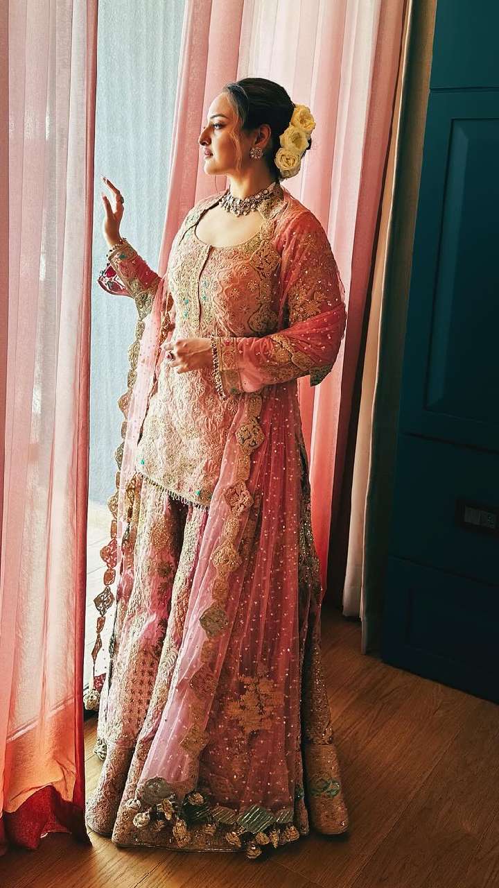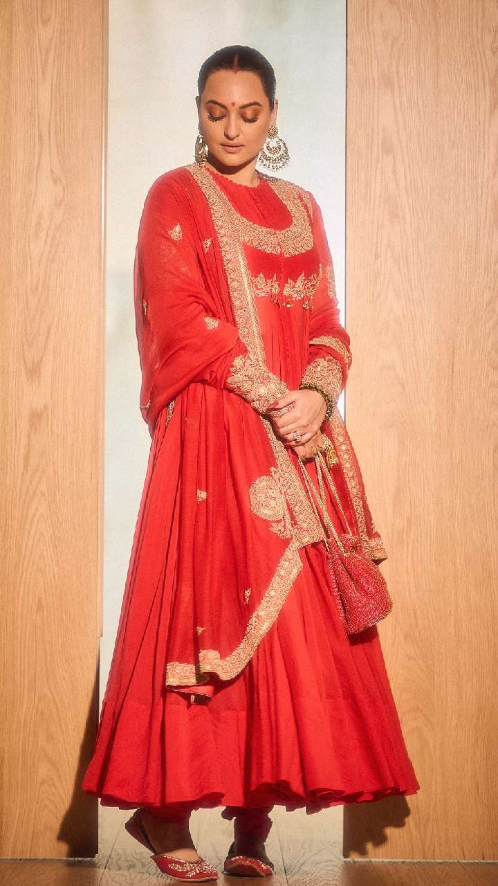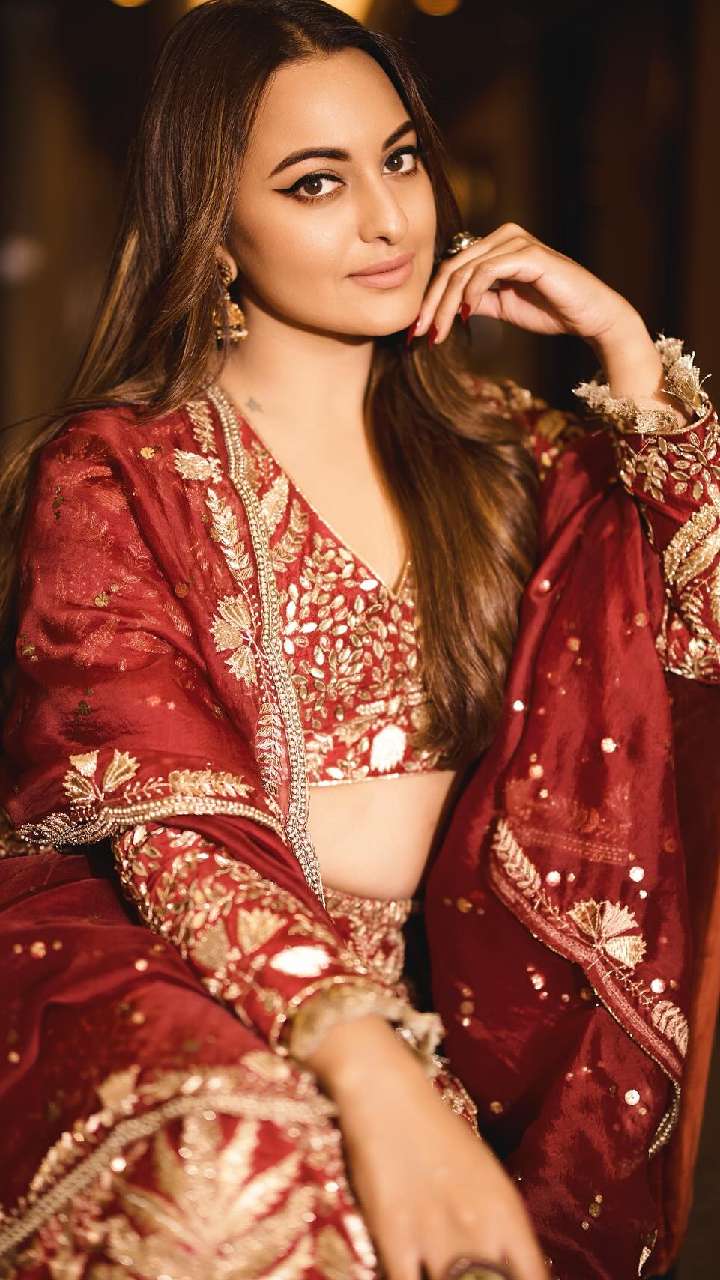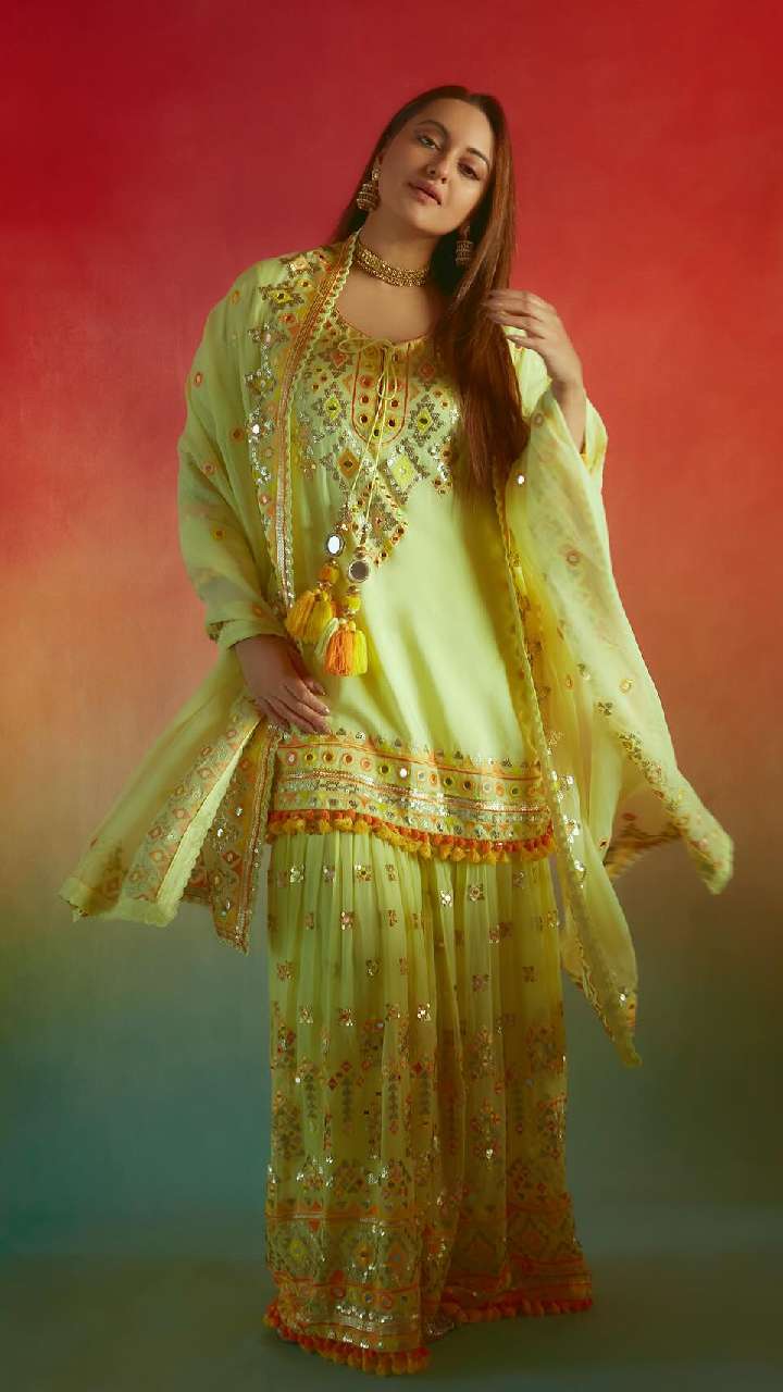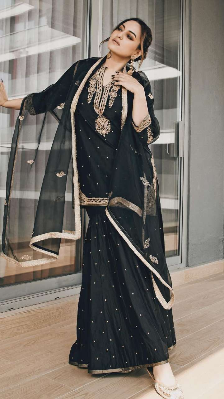 यदि आप फेस्टिव सीजन में खुद को ट्रेडिशनल लुक देना चाहती हैं तो सोनाक्षी के जैसे गोटा वर्क शरारा सूट से आइडिया ले सकती हैं।
