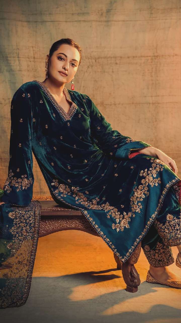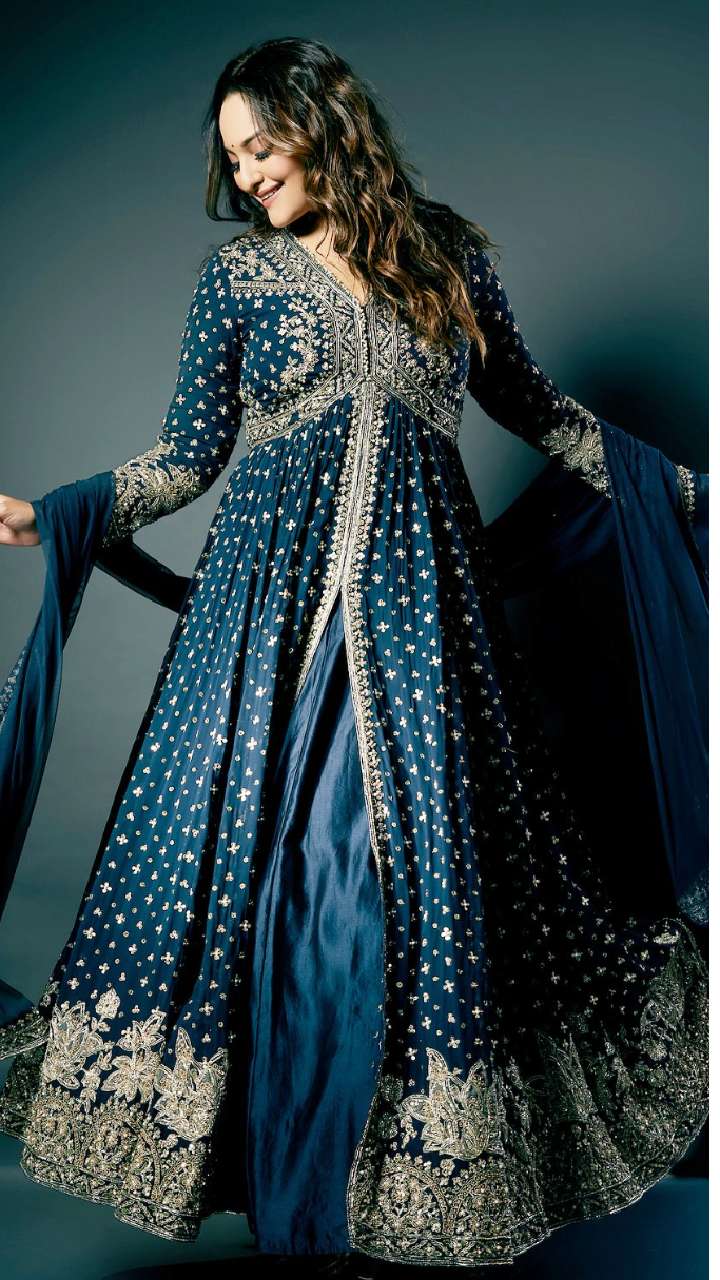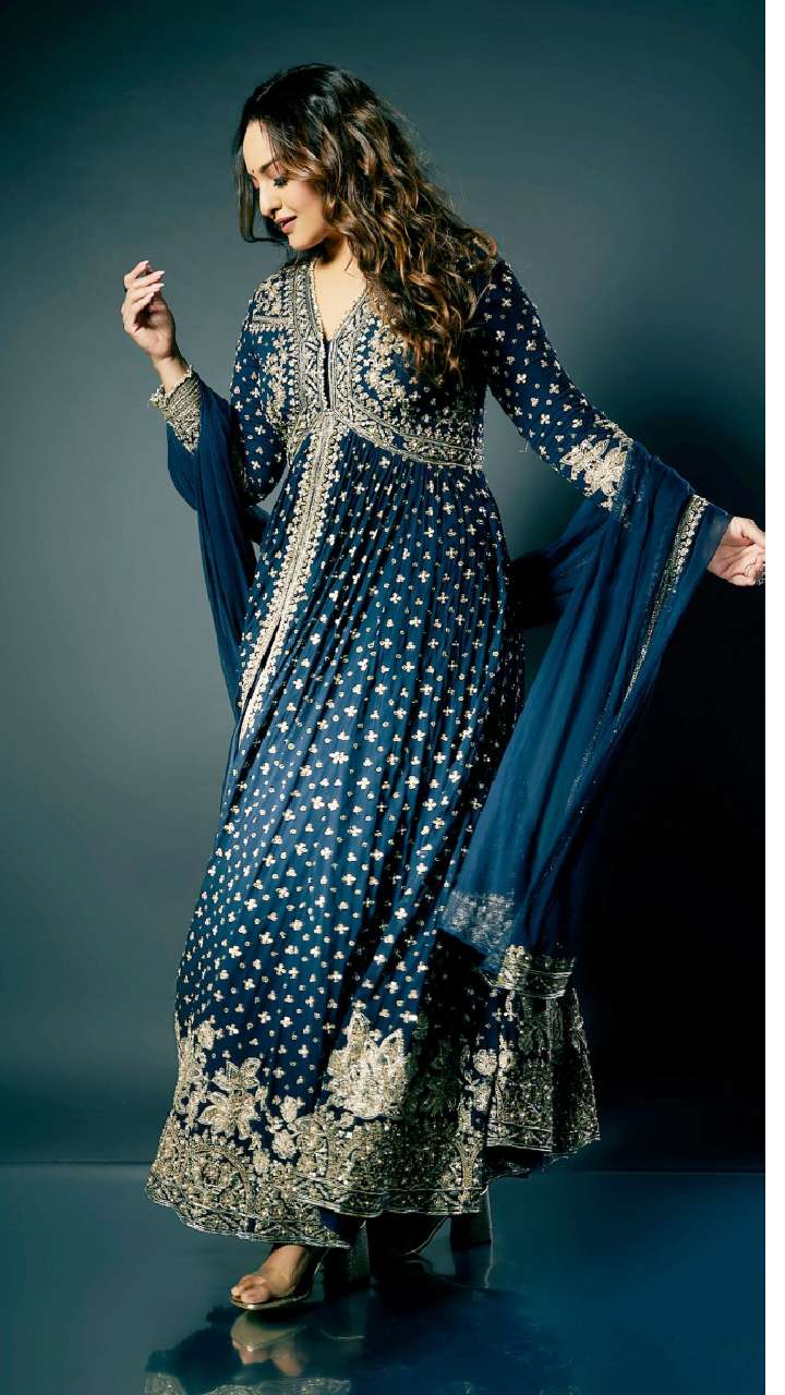 सोनाक्षी डार्क ब्लू कलर के कट दाना वर्क फ्रंट कट सूट में बला की खूबसूरत लग रही हैं। नई नवेली दुल्हन इन त्योहारों पर स्टाइल कर सकती हैं।