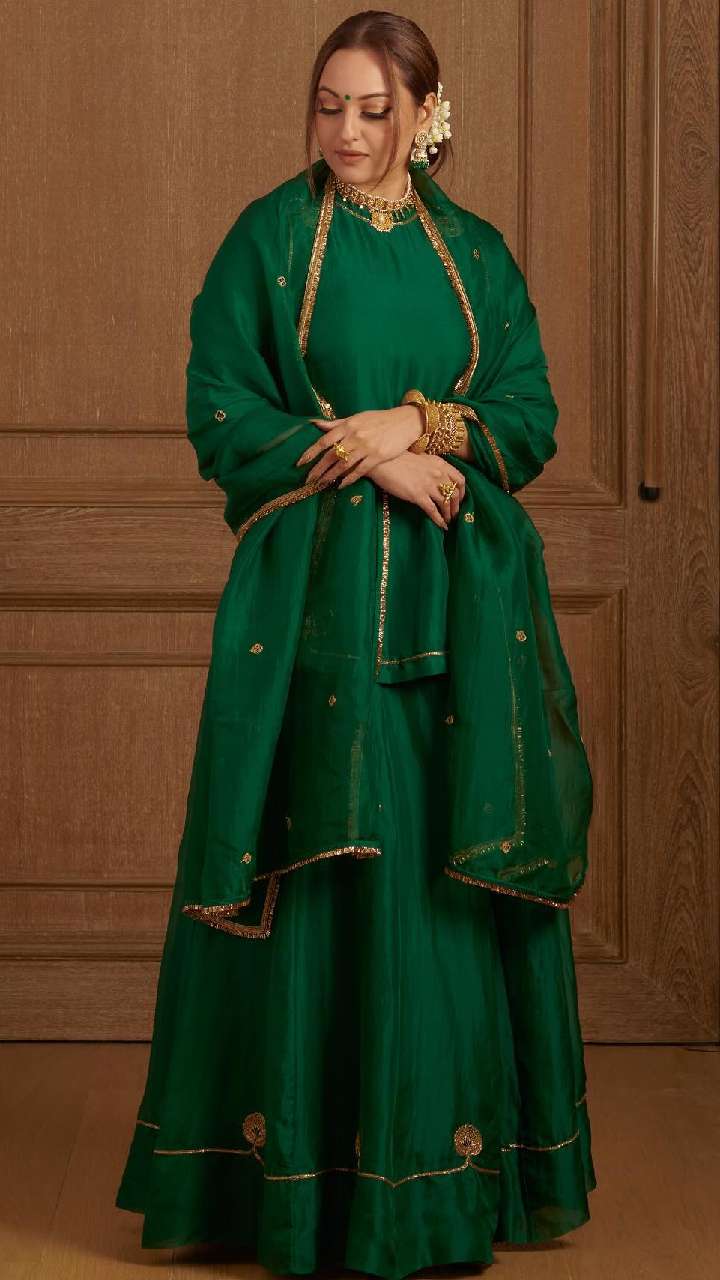 सोनाक्षी सिन्हा ग्रीन कलर के गोल्डन वर्क पेप्लम स्टाइल सूट में बला की खूबसूरत लग रही हैं। इसके साथ गजरा बन हेयर स्टाइल विद झुमकी और मैचिंग नेकपीस सूट कर रहा है।