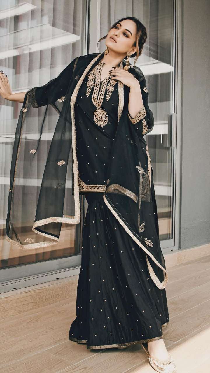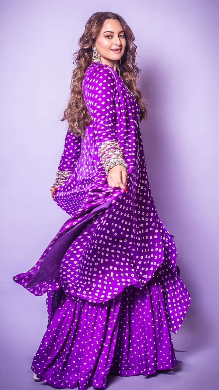 आजकल शरारा सूट काफी ट्रेंड में हैं। ऐसे में आप सोनाक्षी के जैसे सिंपल सोबर बंधेज प्रिंट वाले शरारा सूट लुक को भी ट्राई कर सकती हैं।