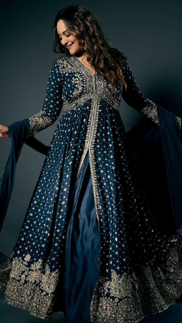 सोनाक्षी का डार्क ब्लू फ्रंट ओपन हैवी वर्क सूट बेहद खूबसूरत लग रहा है। ऐसे सूट पहनकर आप एकदम हुस्न की मल्लिका दिखेंगी।