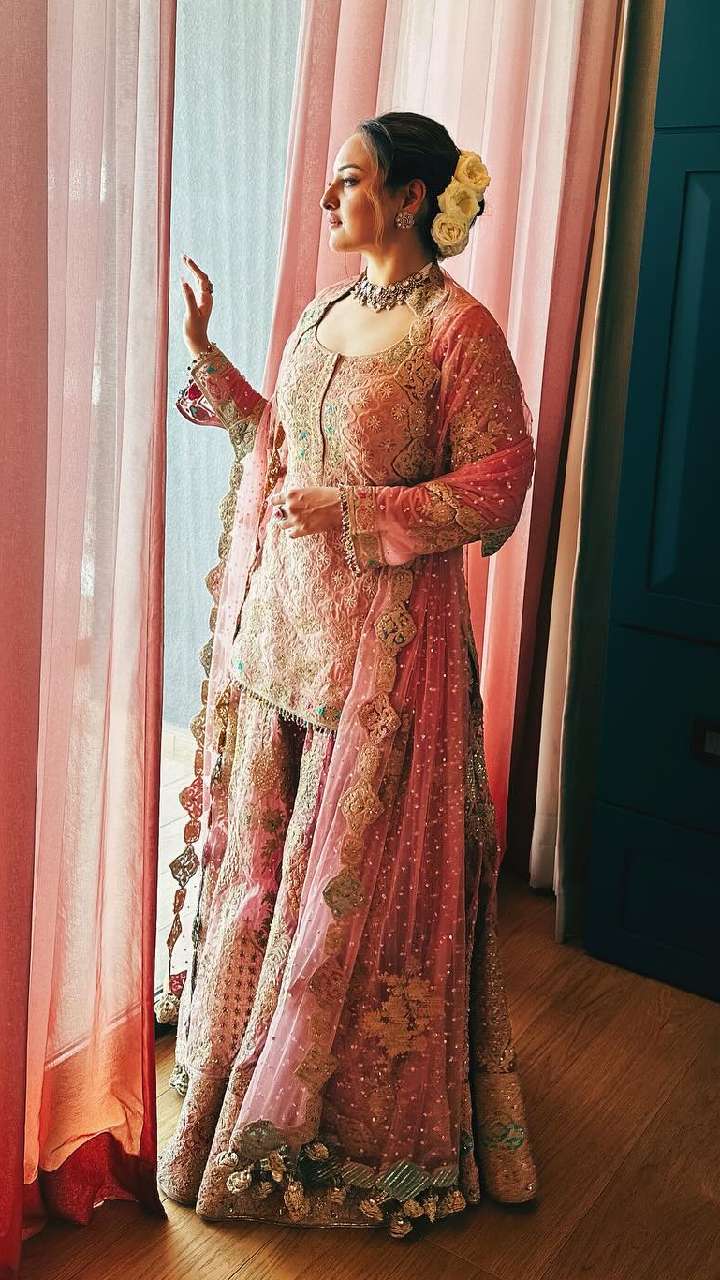 एक्ट्रेस पिंक कलर के हैवी वर्क शरारा सूट में कहर ढहा रही हैं। इसके साथ उन्होंने साइड फ्लावर बन लुक से खुद को और ज्यादा प्रिटी लुक दिया है।