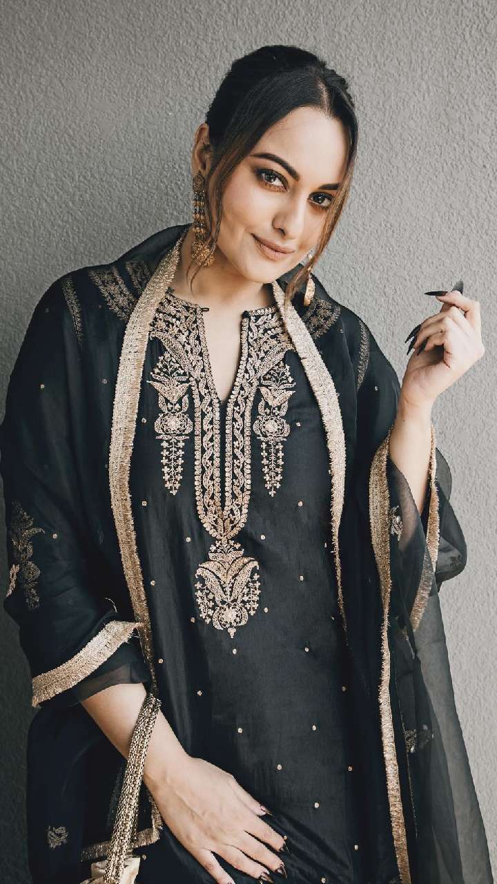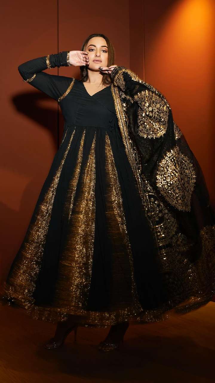 ब्लैक और गोल्डन कलर के अनारकली सूट में सोनाक्षी सिन्हा का लुक बहुत प्यारी लग रही हैं। सोनाक्षी का ये सूट यंग गर्ल्स पर खूब जचेगा।