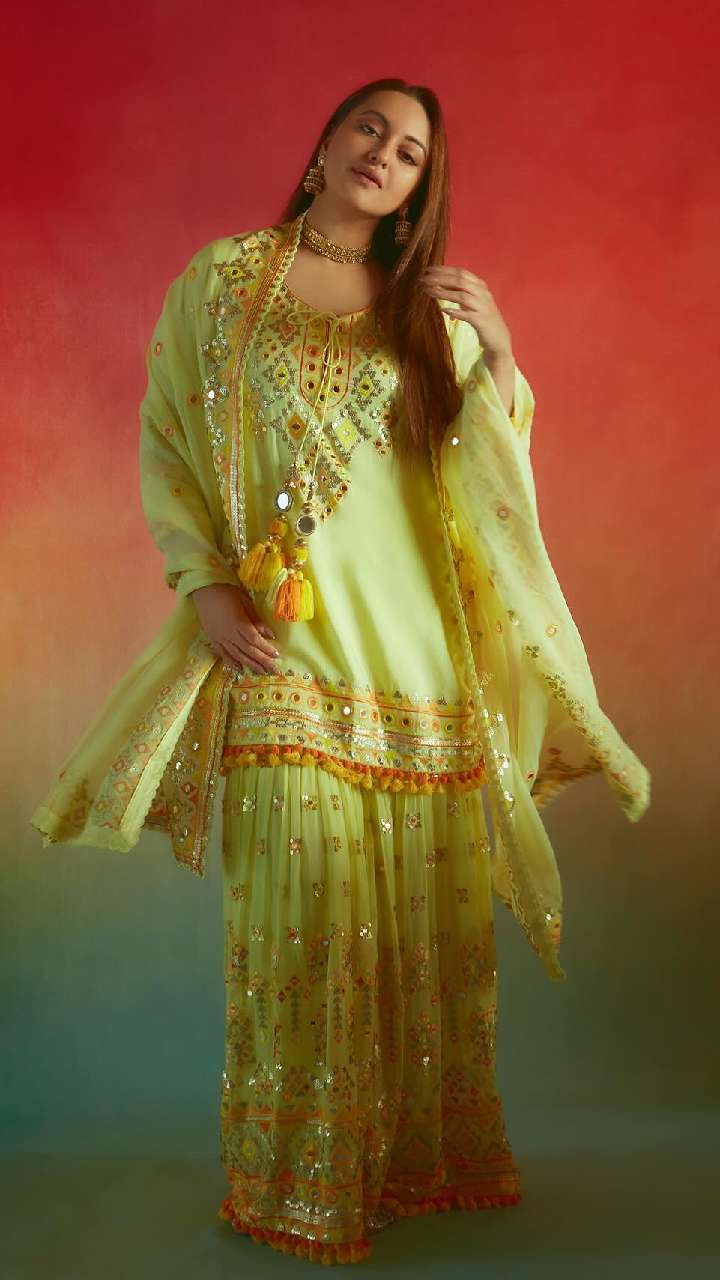 येलो कलर के मिरर वर्क सूट में सोनाक्षी सिन्हा बहुत प्यारी लग रही हैं। मिरर वर्क शरारा सूट आपके लुक में चार चांद लगा देंगी।