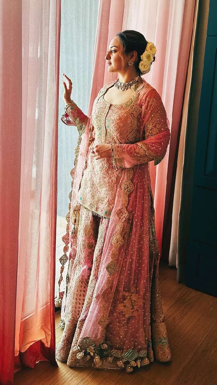 सोनाक्षी सिन्हा का ये हैवी वर्क शरारा पैटर्न सूट डिजाइन खूब जचेगा। फिलहाल इस तरह के हैवी वर्क शरारा सूट में शानदार लग रही हैं।