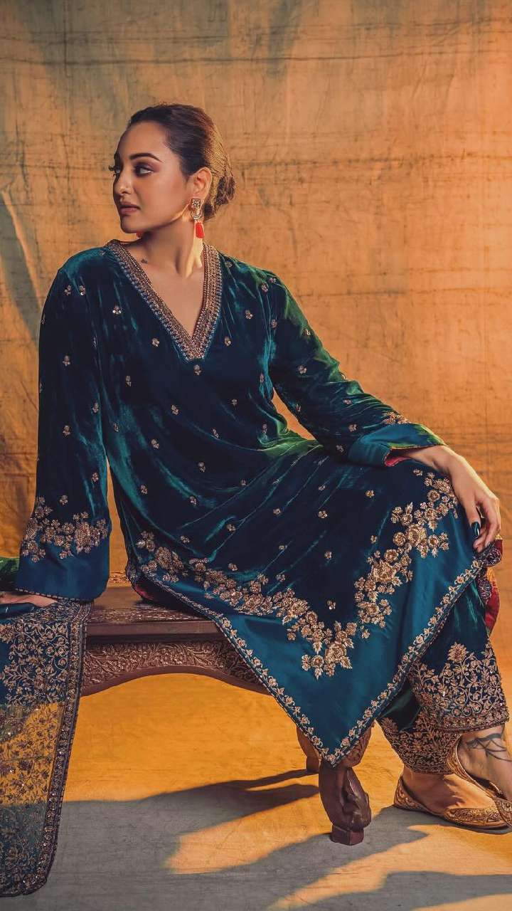 अपने लुक को रॉयल बनाने के लिए सोनाक्षी सिन्हा की तरह ही आप वेलवेट सूट को स्टाइल कर सकती हैं।