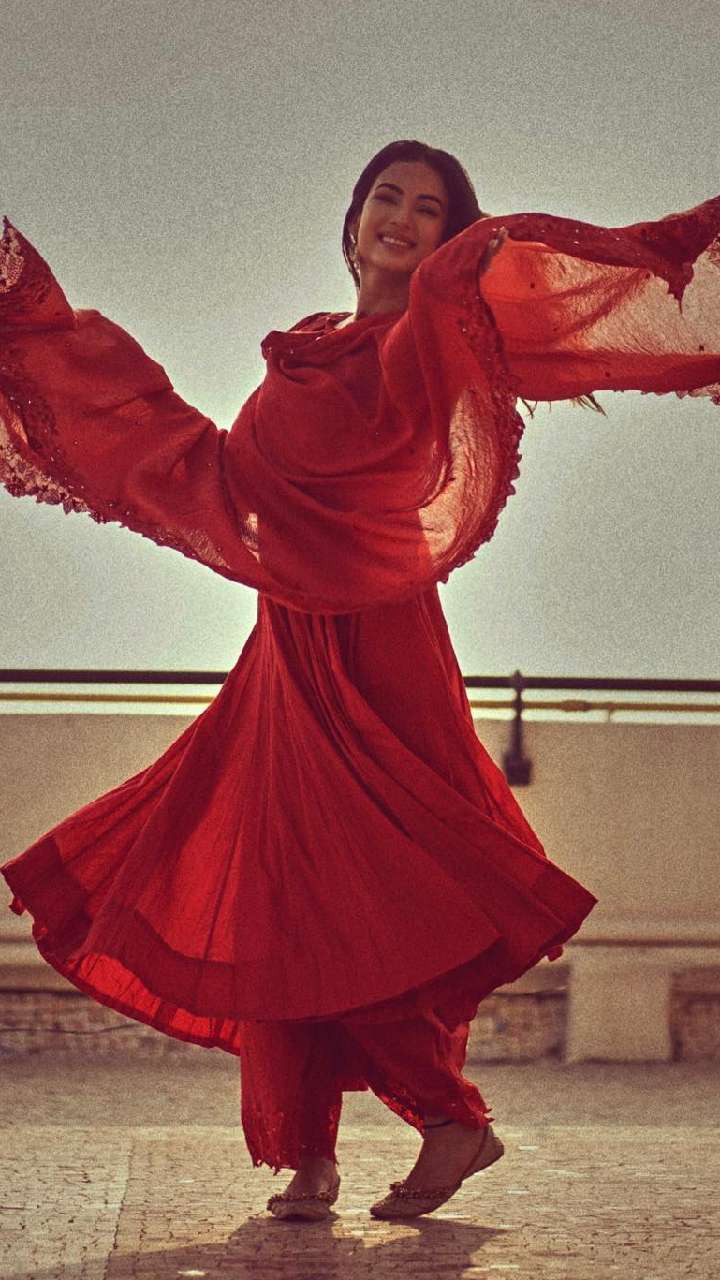 इस तरह का अनारकली सूट भी आपके लुक में चार चांद लगा देगा। रेड कलर के अनारकली सूट में एक्ट्रेस बहुत प्यारी लग रही हैं।