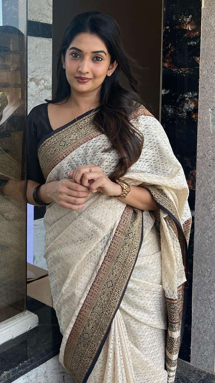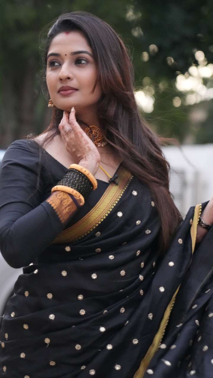 हाफ फुल स्लीव्स ब्लाउज के साथ एक्ट्रेस ने इस सिंपल और डिसेंट ब्लैक साड़ी को स्टाइल किया है, जिसमें एक्ट्रेस काफी प्यारी लग रही हैं।