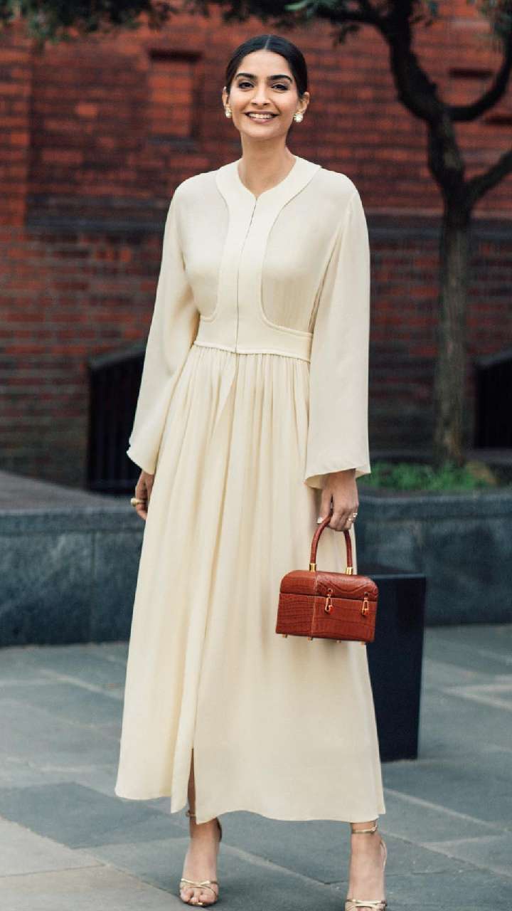 अगर आप लॉन्ग ड्रेस के साथ हैंडबैग वीयर करने का सोच रही हैं, तो आप सोनम कपूर के इस स्टाइल को फॉलो कर सकती हैं। एक्ट्रेस ने इसमें ब्राउन कलर का हैंडबैग कैरी किया है, जो काफी कमाल का लग रहा है।