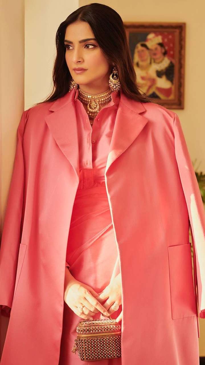 सोनम ने लाइट ग्रीन फ्लोरल प्रिंट साड़ी के साथ व्हाइट बेस विद रेड फ्लावर प्रिंट लांग कोट से काफी स्टाइलिश लुक दिया है।