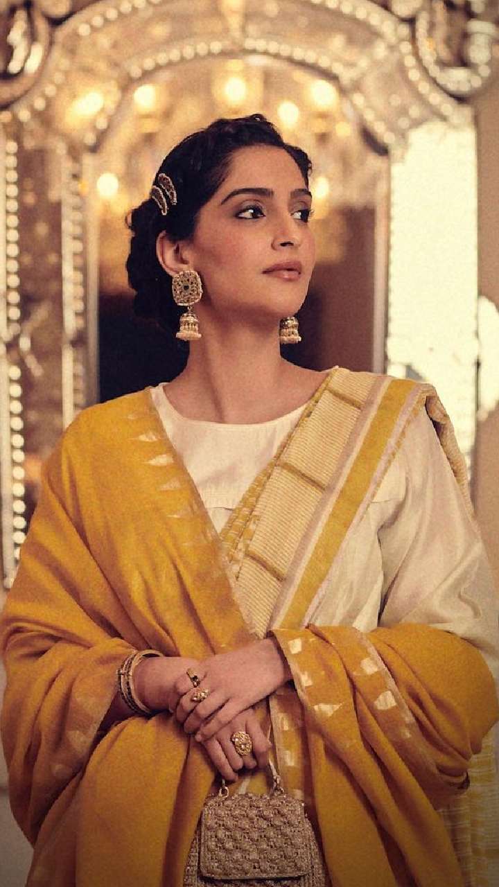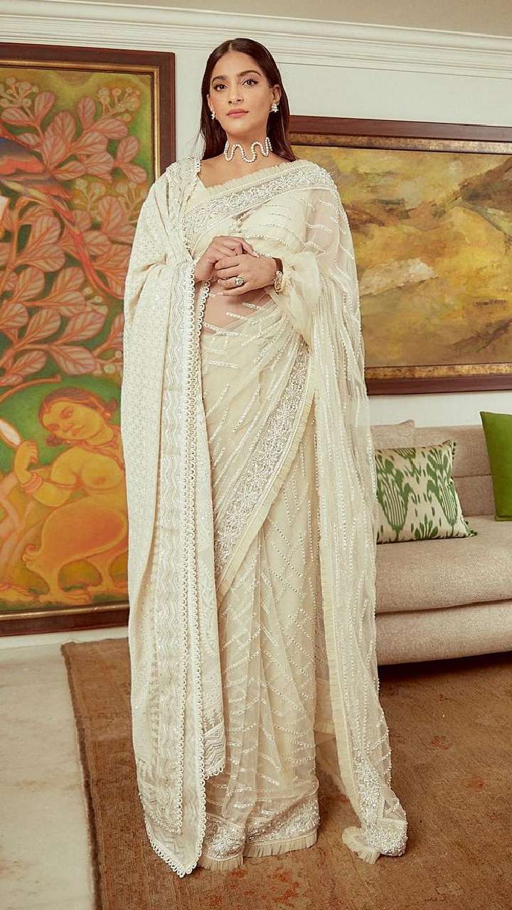 सोनम का ये ऑल व्हाइट साड़ी लुक भी काफी एलिगेंट है।