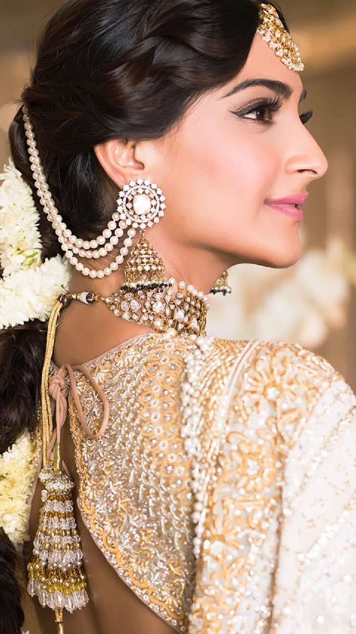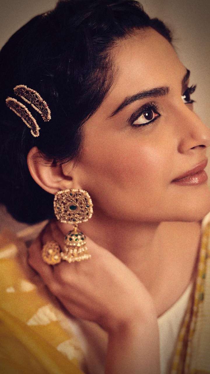 सोनम कपूर का स्टोन विद पर्ल झुमकी लुक काफी खूबसूरत लग रहा है। ऐसे लेयर इयररिंग लहंगों के साथ खूब जचते हैं।