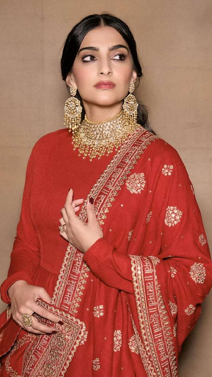 सोनम कपूर ने रेड कलर गोल्डन एम्ब्रॉयडरी सूट के साथ बिग गोल्डन कुंदन झुमके पेयर किए हैं। जो काफी रॉयल लुक दे रहे हैं।