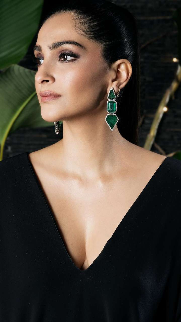 सोनम कपूर ने पिकॉक डिजाइन वाला इयररिंग पहना है, जिसमें वह रॉयल लुक दे रही हैं। इस तरह के इयररिंग आप भी अपने सूट या साड़ी के साथ पेयर करके शानदार लग सकती हैं।