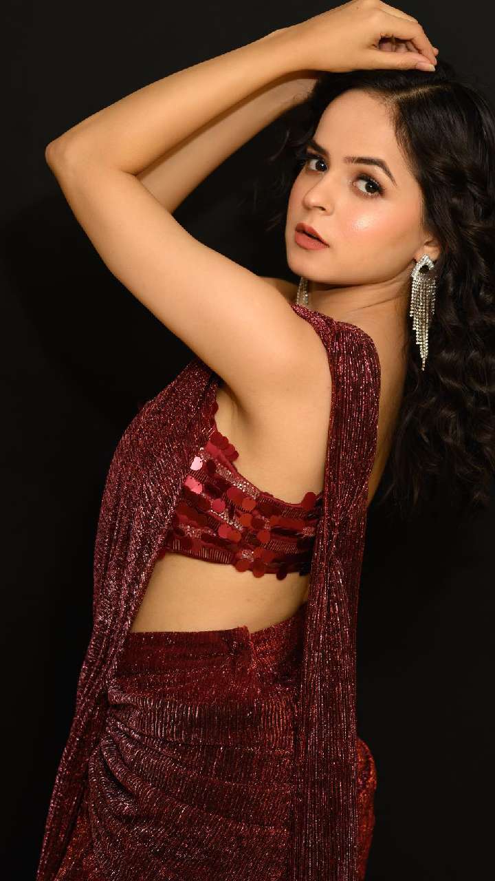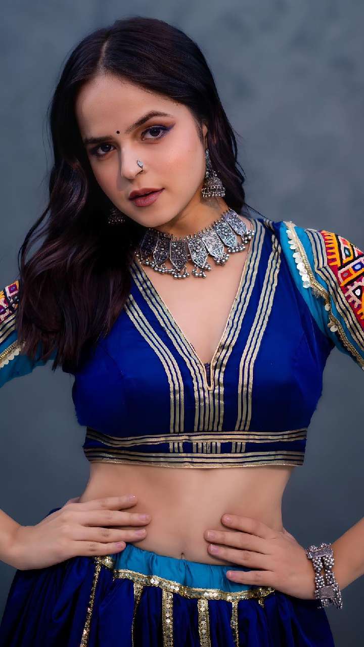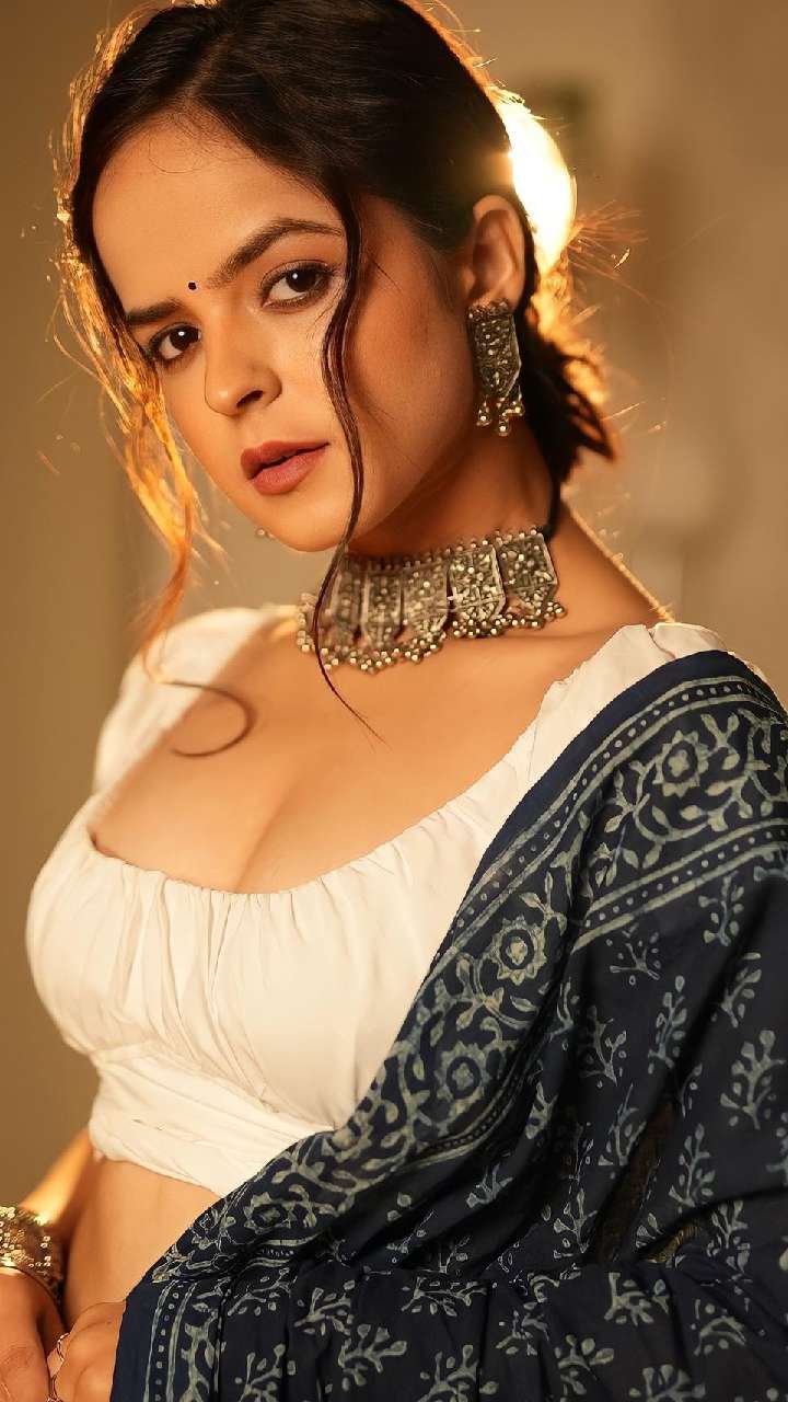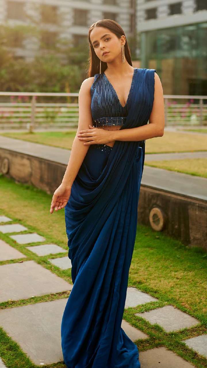 ब्लू कलर की साड़ी के साथ पलक ने व्ही नेक ब्लाउज डिजाइन पेयर किया है। पलक का ये लुक काफी ज्यादा हॉट लग रहा है।