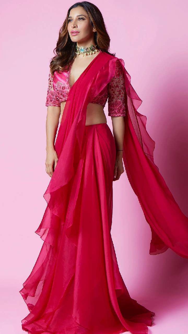 सोफी चौधरी का रेड रफल साड़ी लुक शानदार लग रहा है। इसके संग डीप वी नेक प्रिंटेड ब्लाउज काफी खिल रहा है।