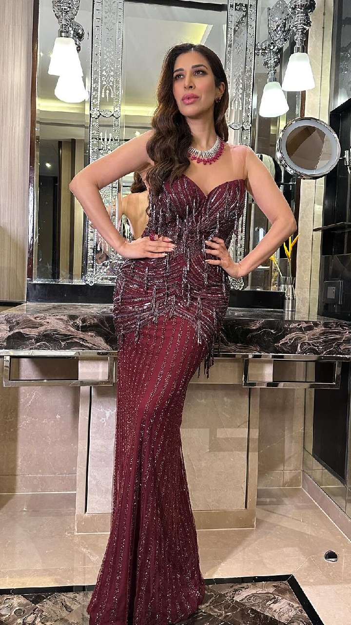 सोफी इस रेड कलर के साटन ट्यूब गाउन में हुस्न की मल्लिका लग रही हैं। ये नाईट पार्टी के लिए ट्राई किया जा सकता है।