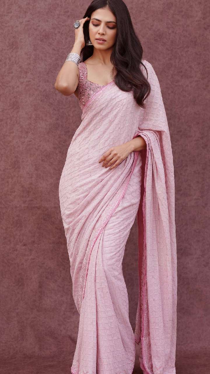 एक्ट्रेस का सेल्फ प्रिंट पिंक साड़ी हेवी वर्क ब्लाउज लुक काफी अट्रैक्टिव लुक दे रहा है। ये आप किसी भी छोटे फंक्शन में ट्राई कर सकती हैं।