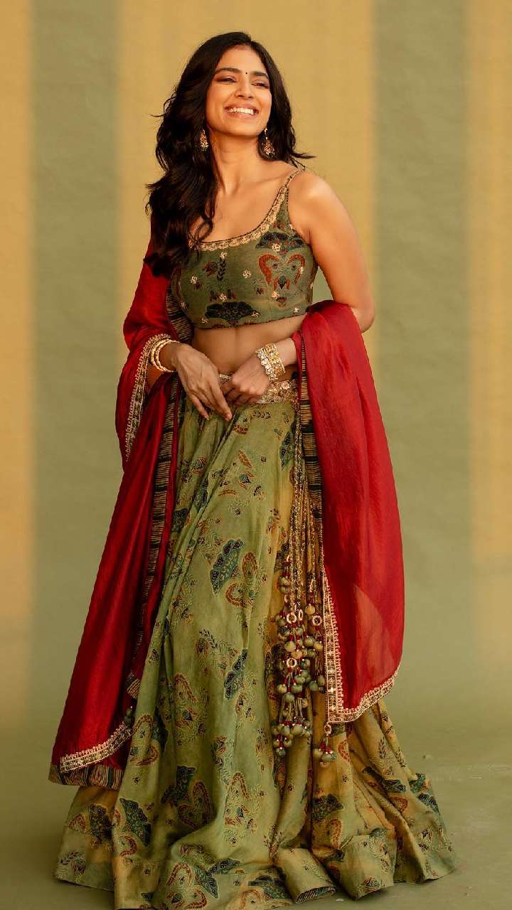 मालविका मोहनन का प्रिंटेड ग्रीन लहंगा आपके मेहंदी फंक्शन या संगीत सेरेमनी में चार चांद लगा देगा।