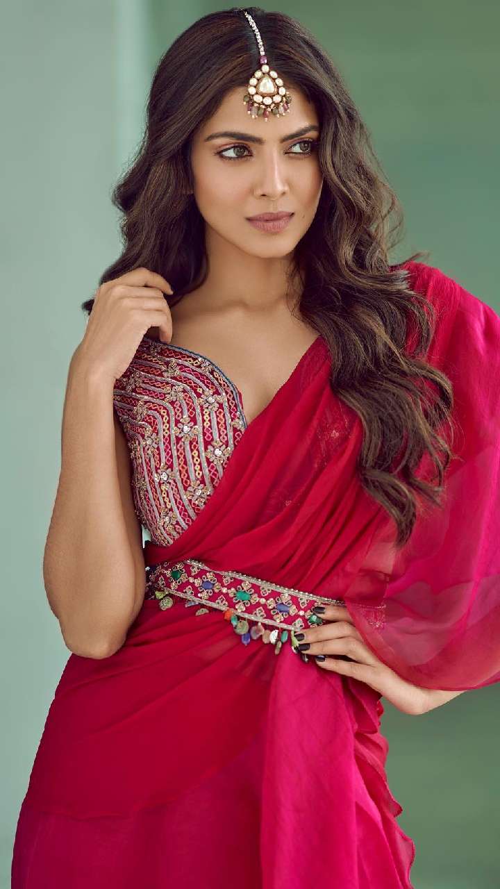 एक्ट्रेस का डार्क पिंक रफल साड़ी हेवी वर्क ब्लाउज मांग टीका लुक काफी खूबसूरत लग रहा है।