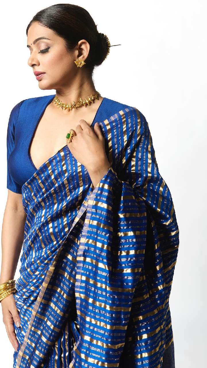 यदि कुछ ट्रेडिशनल ट्राई करना है तो प्रियामणि की ब्लू बंधेज साड़ी आपके लुक में चार चांद लगा देगी। इसके साथ डीपनैक ब्लाउज काफी स्मार्ट लग रहा है।