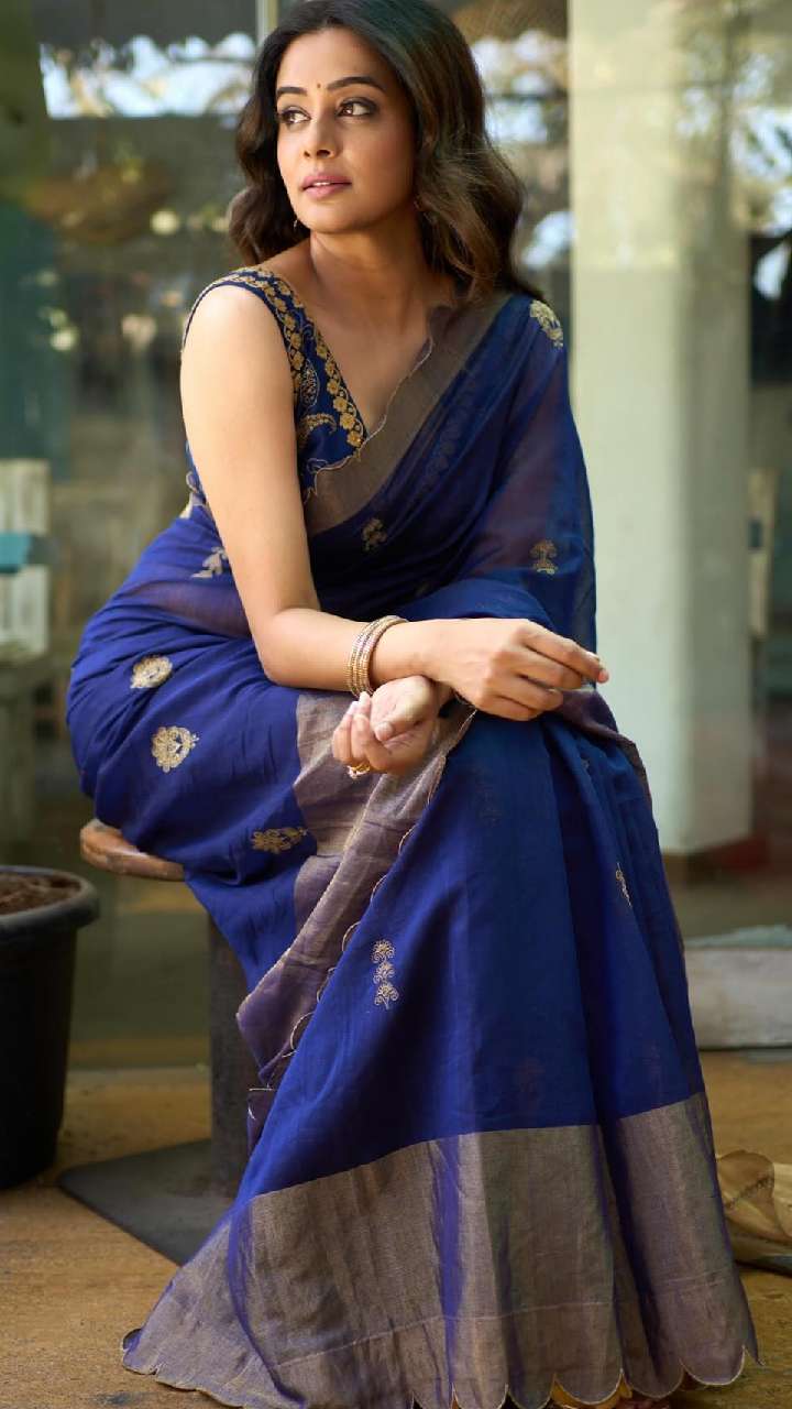 प्रियामणि इस ब्लू कलर की सिल्क साड़ी कट स्लीव्स ब्लाउज में काफी स्टाइलिश लग रही हैं। समर सीजन के लिए ये परफेक्ट लुक है।
